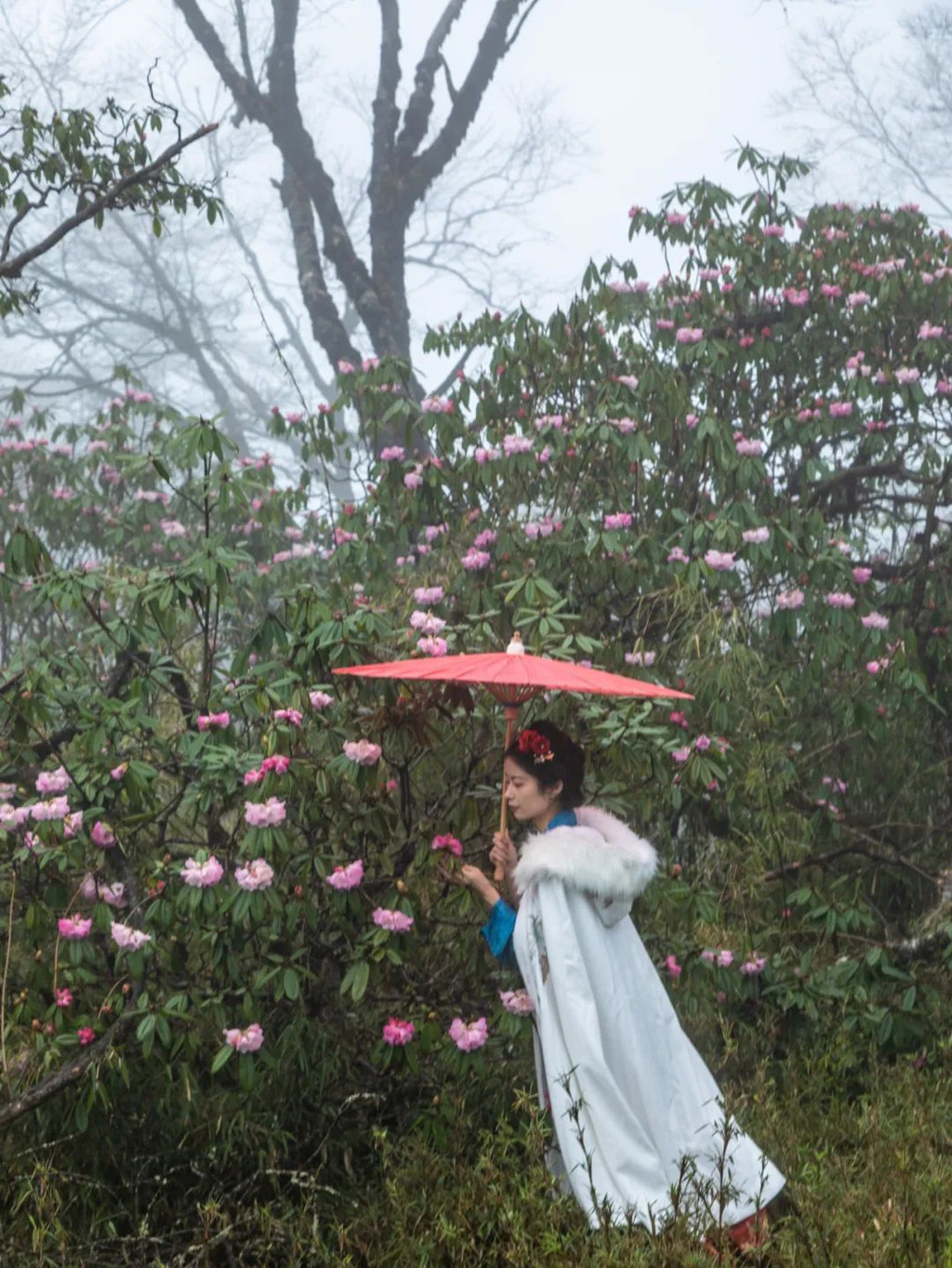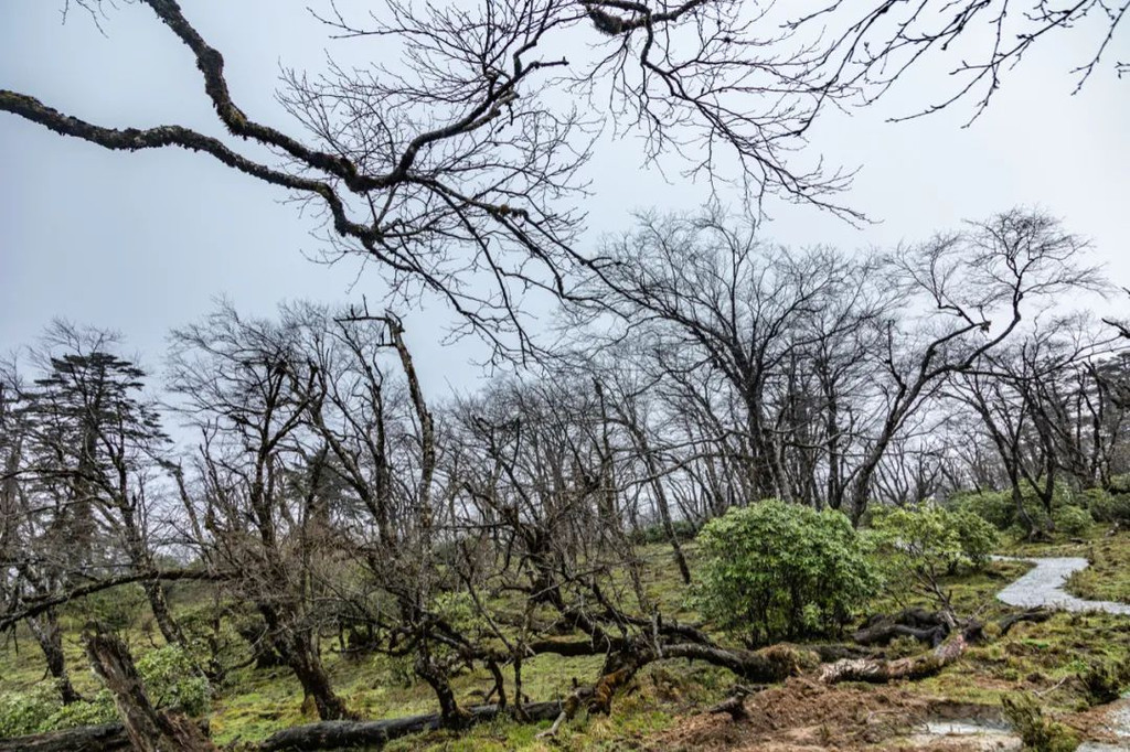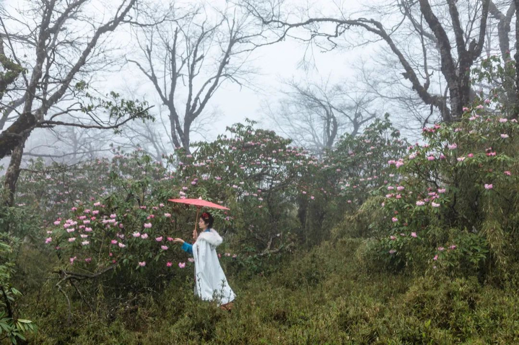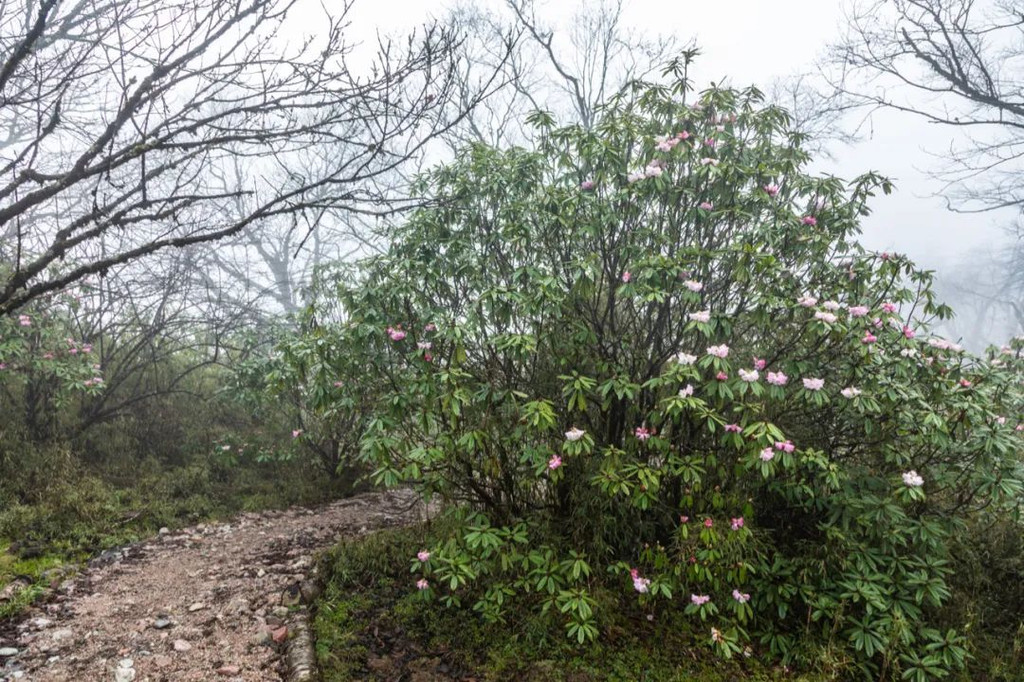 怪树林的中后段还有成片的杜鹃林,人面桃花相映红的美好在这里也能拍出来!虽然很多地方都有高山杜鹃,但像王岗坪这里的杜鹃一样高大且密集的杜鹃林还是不常见的,这个季节的杜鹃花依然绽放着笑颜,还有许多花骨朵含苞待放,这种美景你不想亲眼瞧瞧吗?