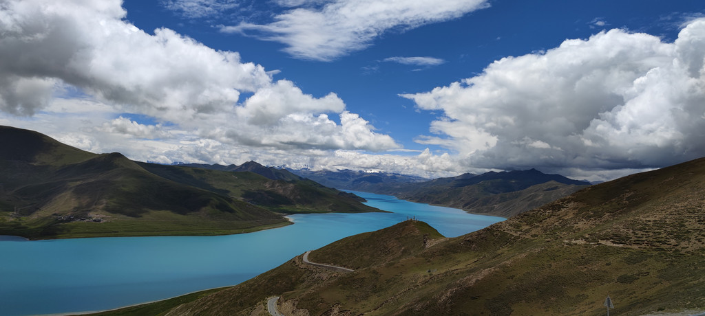 在景区内观景台远眺,需要持门票进入。前方是羊卓雍措和雪山,沿着公路可以去浪卡子县。