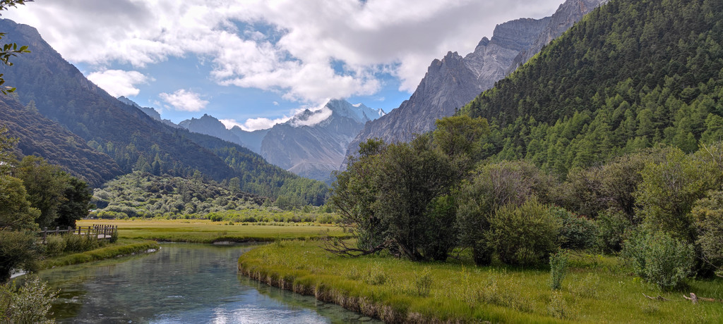 冲古草原。远处是央迈勇神山,从这里坐电瓶车1个小时到达洛绒牛场。(电瓶车一定要买往返票,步行路程太远了。)