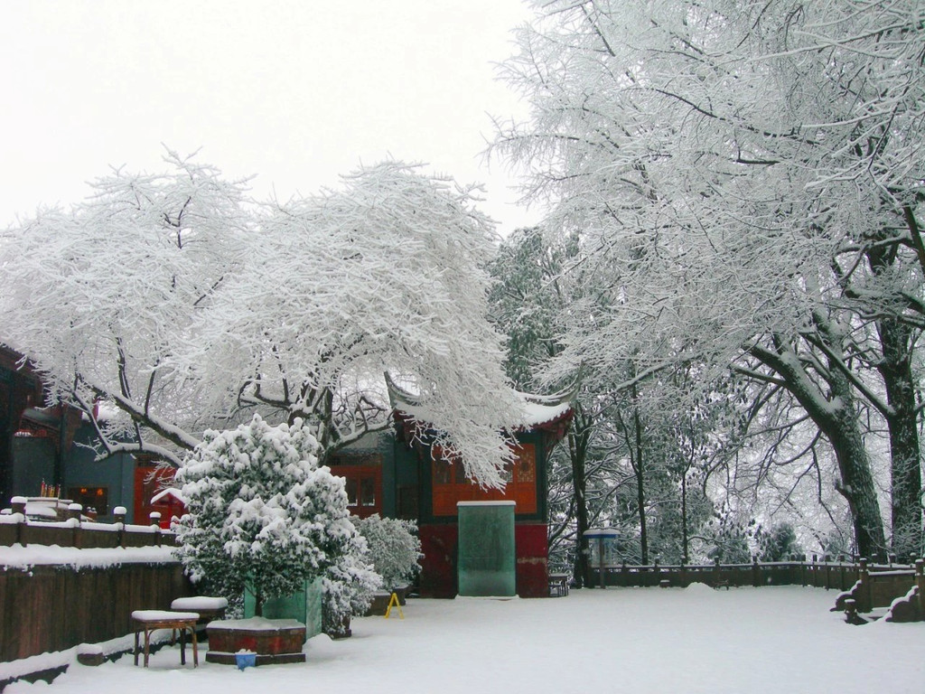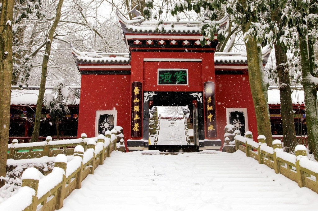 天盖寺、干露井、皇茶园...寂静的雪,落在蒙顶的每一个角落。天地之间白茫茫的一片,唯有红墙白雪美的不真实!特别是一场大雪过后,白色冰棱挂满树枝,掩映着红色的山门,结冰的石阶,从眼前一直通向远方,白色世界中,若隐若现的几点红,像极了京都冬日里的某座寺庙。