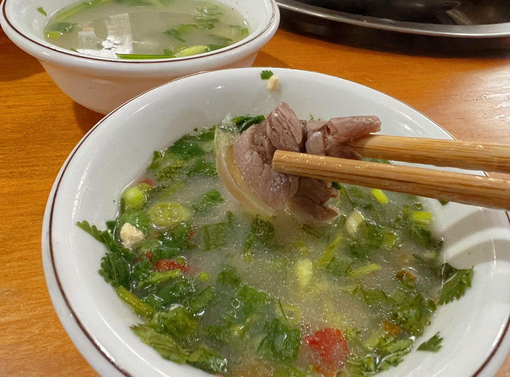 在雅安喝羊肉汤,也是要讲究技巧的。人多的话推荐点羊肉汤锅,量大味美。人少的话点碗羊肉就够吃。这里的羊肉、羊肚、羊肠都是按斤称的。羊汤是大骨熬制的,喝起来非常鲜。羊肉也是煮熟了的,下锅烫一烫就能直接吃了,不蘸调料都非常好吃。