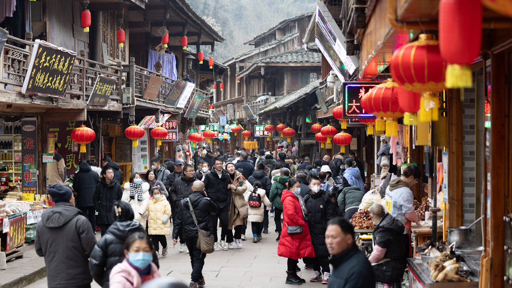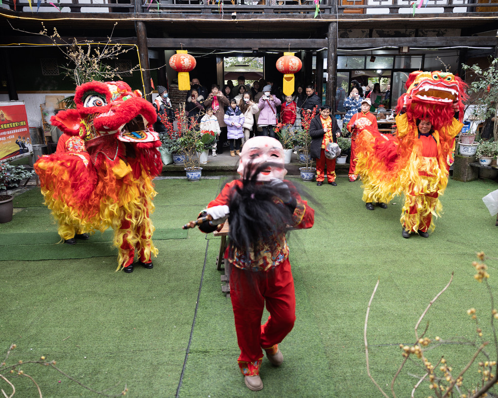 熙熙攘攘的人群中,街上店铺生意都还不错,还偶遇到知县巡街和舞狮拜年等。