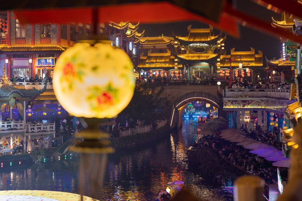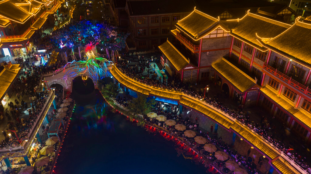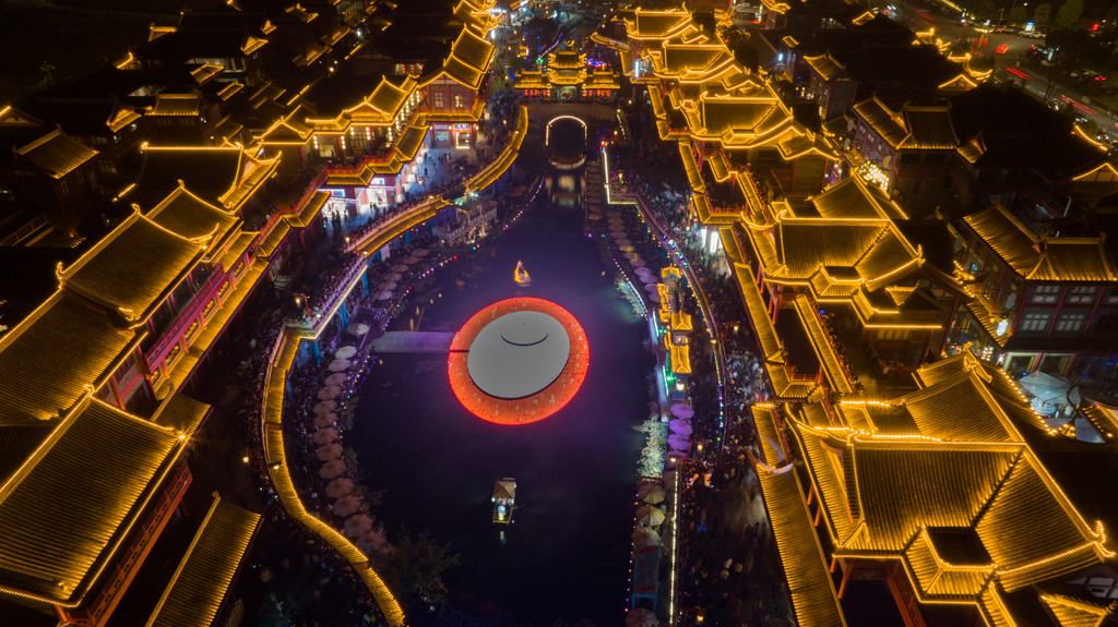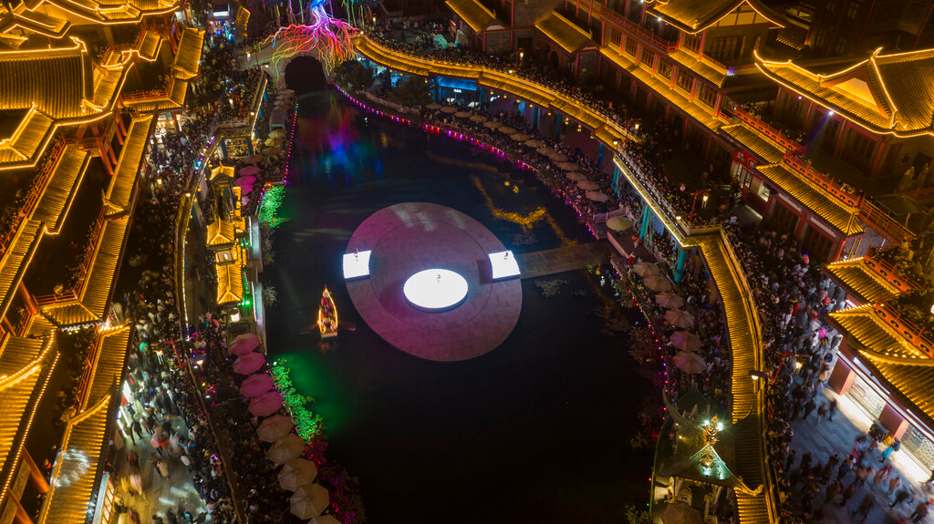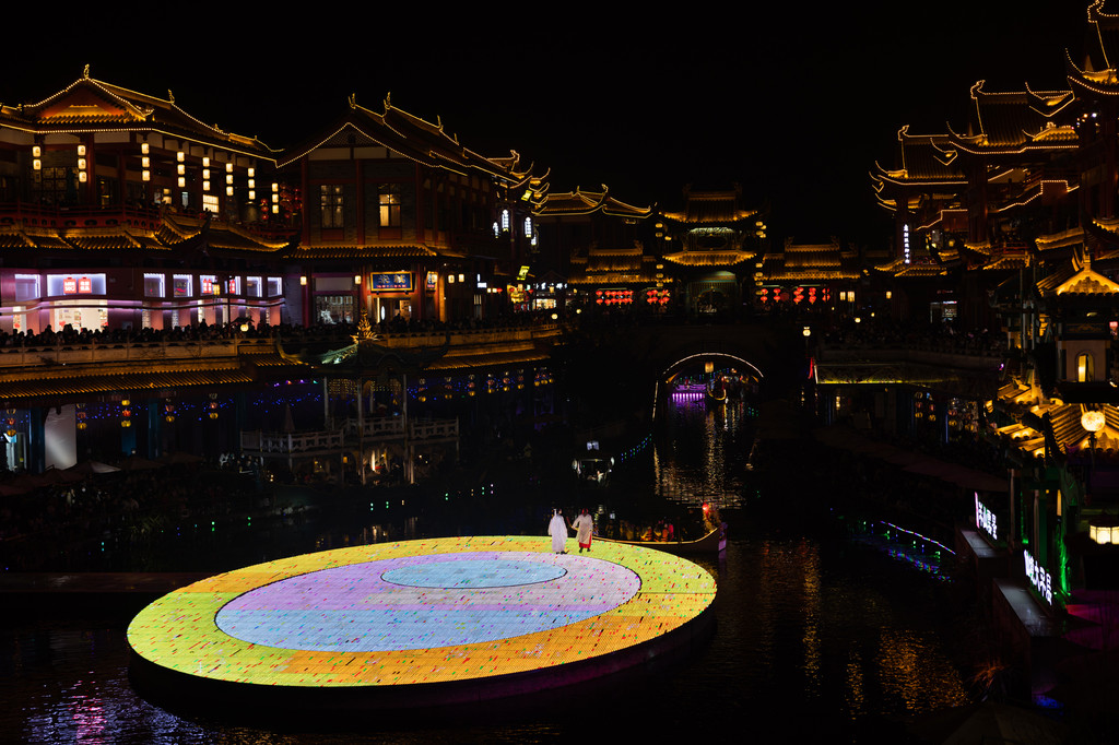 当河道中间舞台灯光亮起,精彩的表演开始后,水街的氛围更是达到了高潮。人们或是坐在河边,或是站在上下两层临河街边,或是站在各处临河楼宇窗前檐下,翘首眺望河中演出,若是坐了游船的游客,更可以绕着河中舞台划动,近距离观看表演。