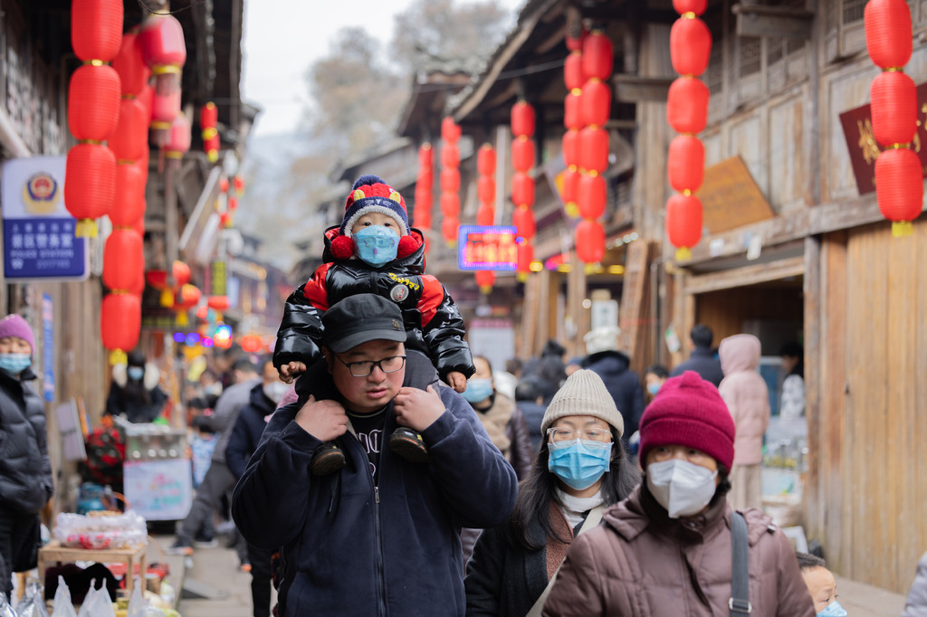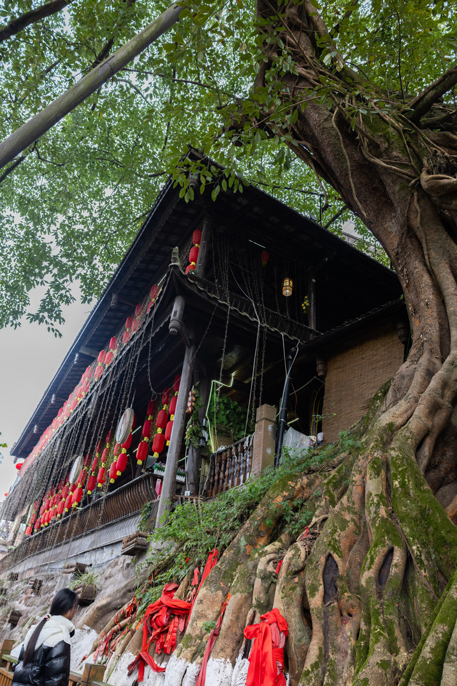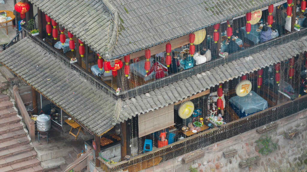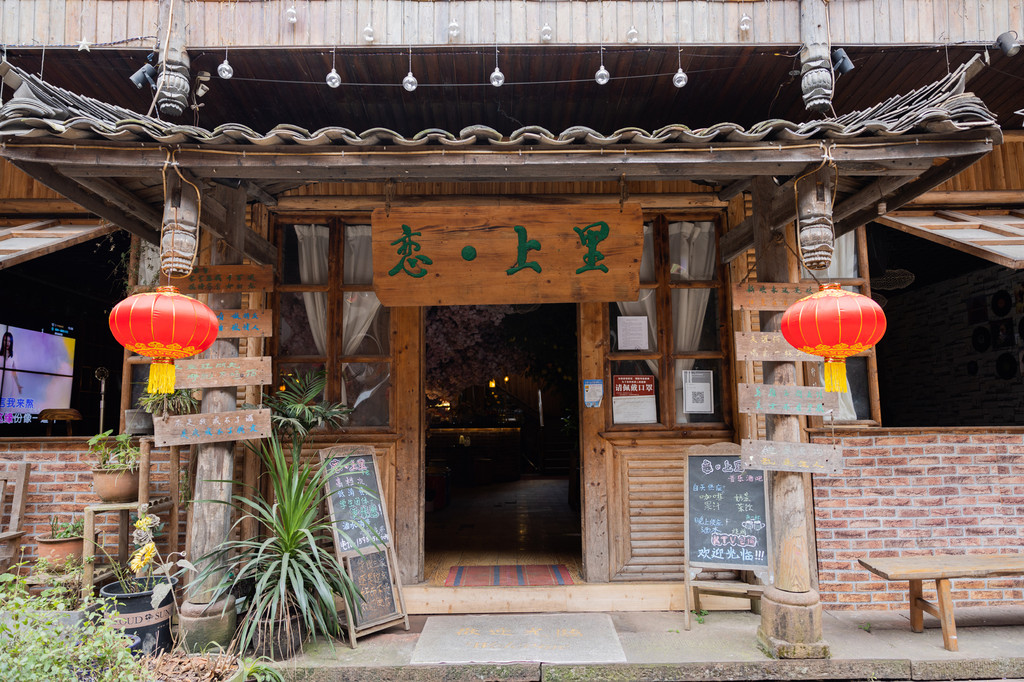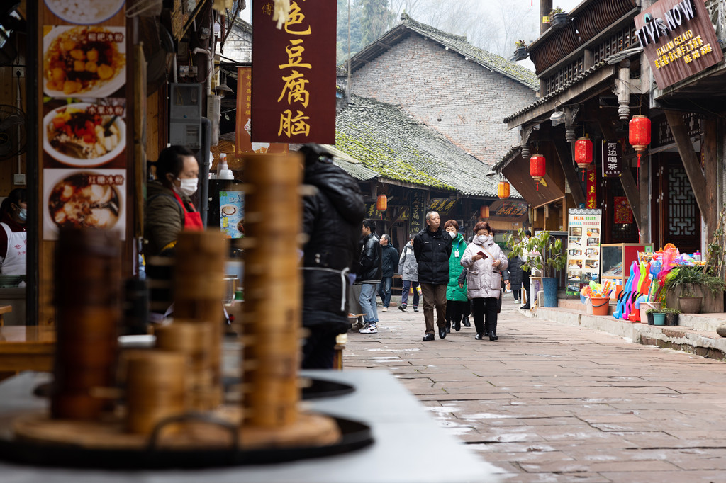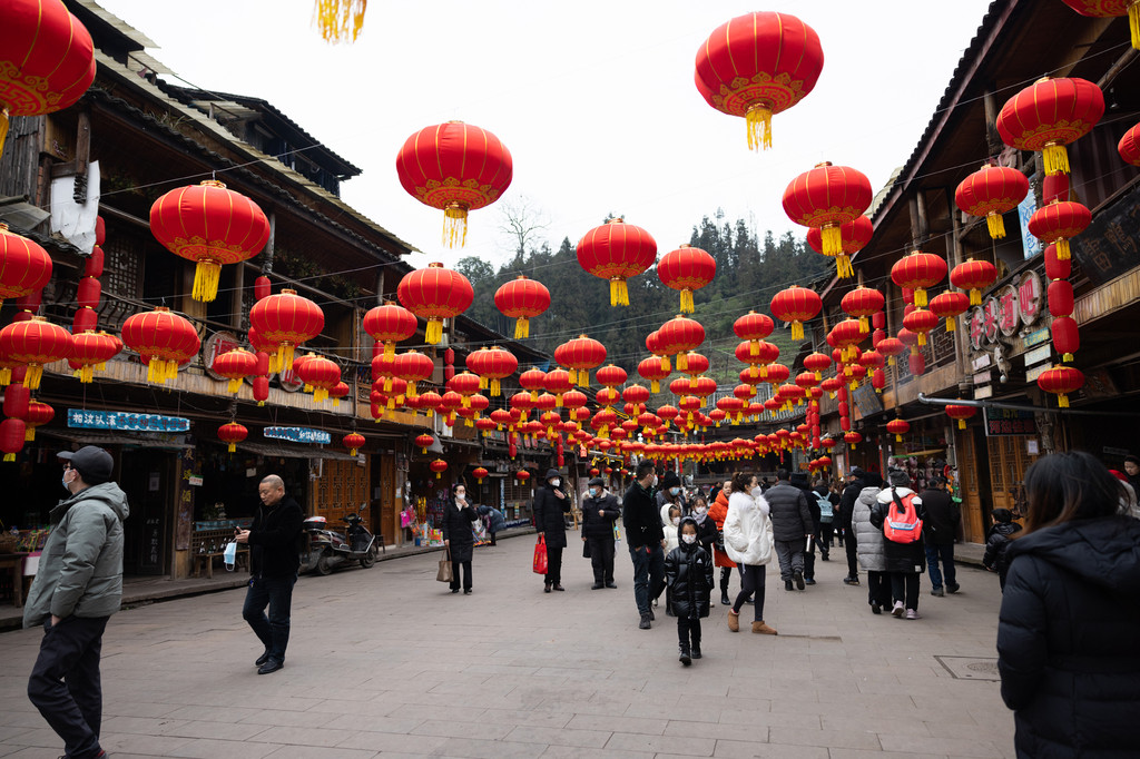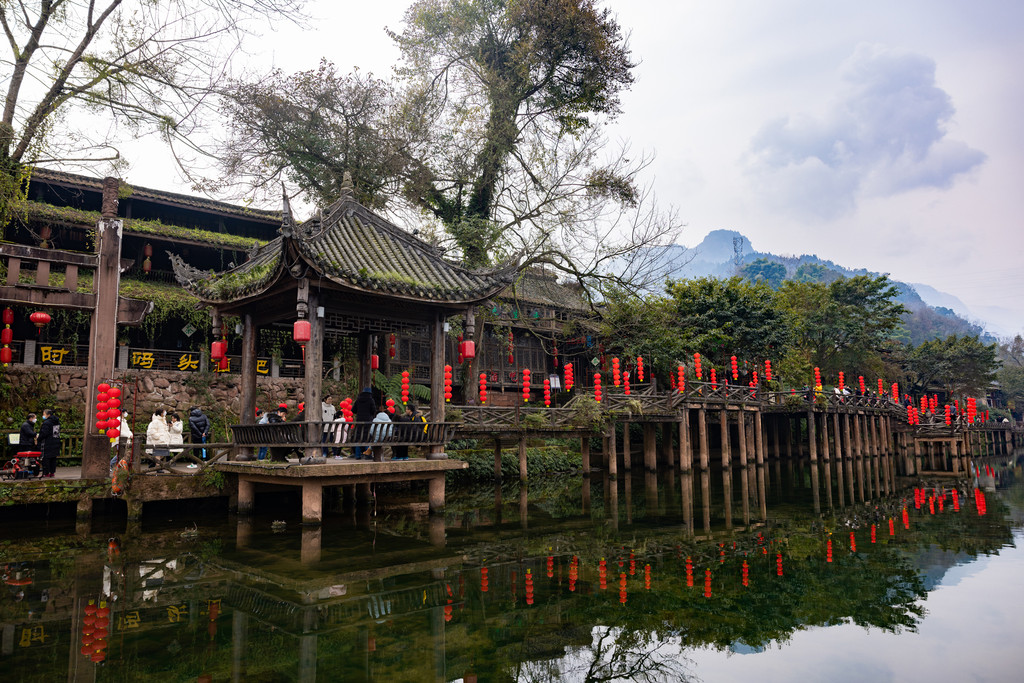 上里古镇可能是因为紧邻碧峰峡原因,古镇上人多很热闹,大红灯笼挂满大街小巷,年味十足。