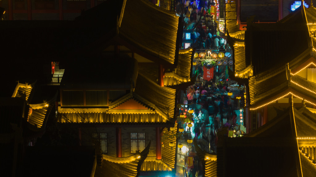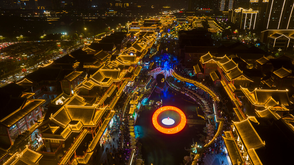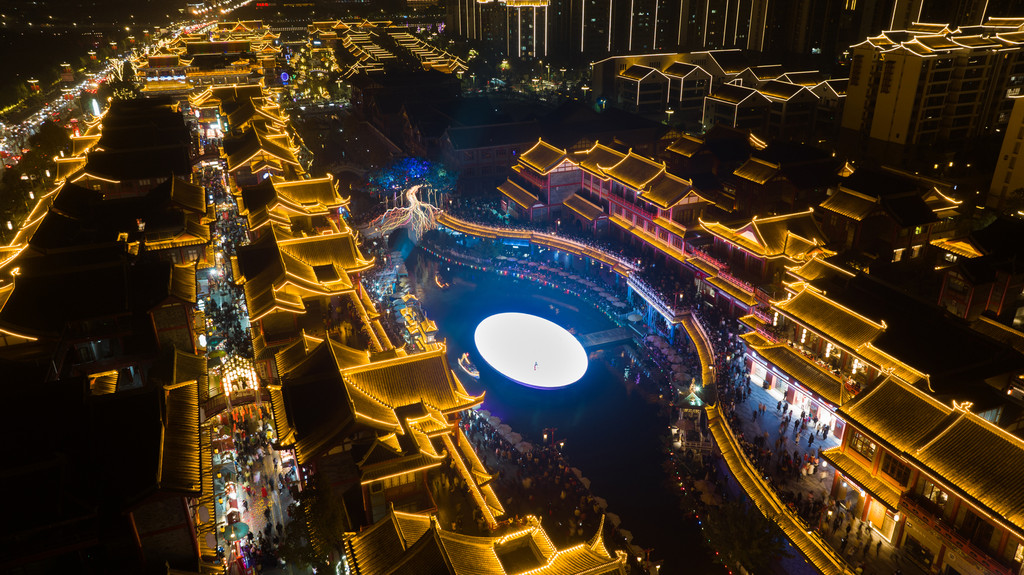 夜色中水街霓虹闪烁,灯火辉煌,虽是古风建筑,却也现代感十足。水街区域内有大型购物和餐饮区域,有小吃美食和特色商品售卖区域,可以算是一个人流量超大的特色商圈。夜幕下无数游客市民来到水街,熙熙攘攘,很多游客都是一身古风打扮,我们也随着人群兴奋的从一条街道逛到另一条街道,大饱眼神和口福。街道中央宽阔的河道中,还有古风游船来来往往,连撑船的NPC,也是妥妥的古风装束,晃眼之间,竟有穿越夜游大唐盛世的错觉。