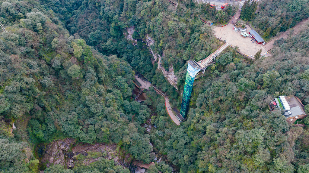 不过我们还是没有选择滑竿,稍事休息后继续忐忑的往前走,直到远远看到那高高挂在悬崖峭壁上的电梯。此时我们也放下心来,从中间的滑竿处走过来,虽然也有少量上坡路,但并不多,其实我们只不过是走到峡谷底部的电梯处,乘坐电梯来到峡谷上面,根本无需再走上去。当然体力够好,想要爬上去应该也是可以的吧,所以滑竿的说错了吗?当然没有!他不过是和熊猫基地的工作人员一样,只是告知部分真实信息而已。因此前去的游客最好选择从坐观光车上山那条路线进去,电梯处出,不然反向走的话得爬山爬安逸。