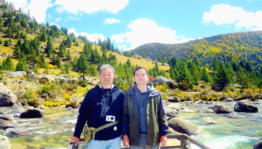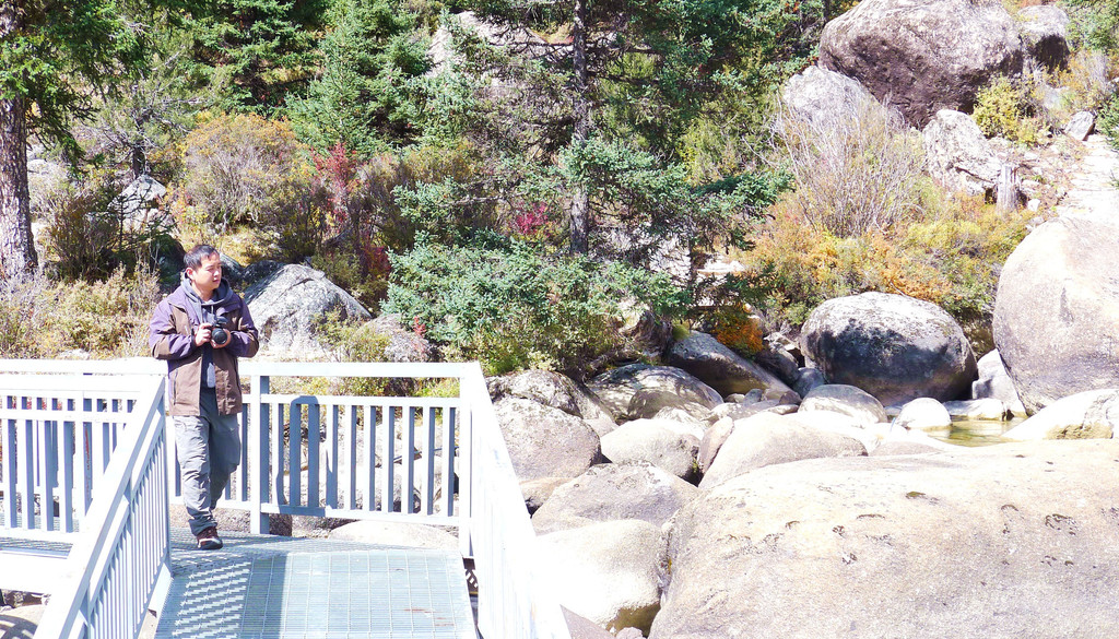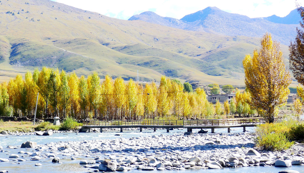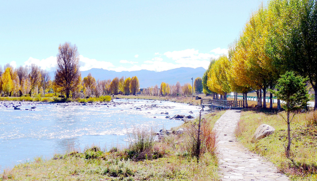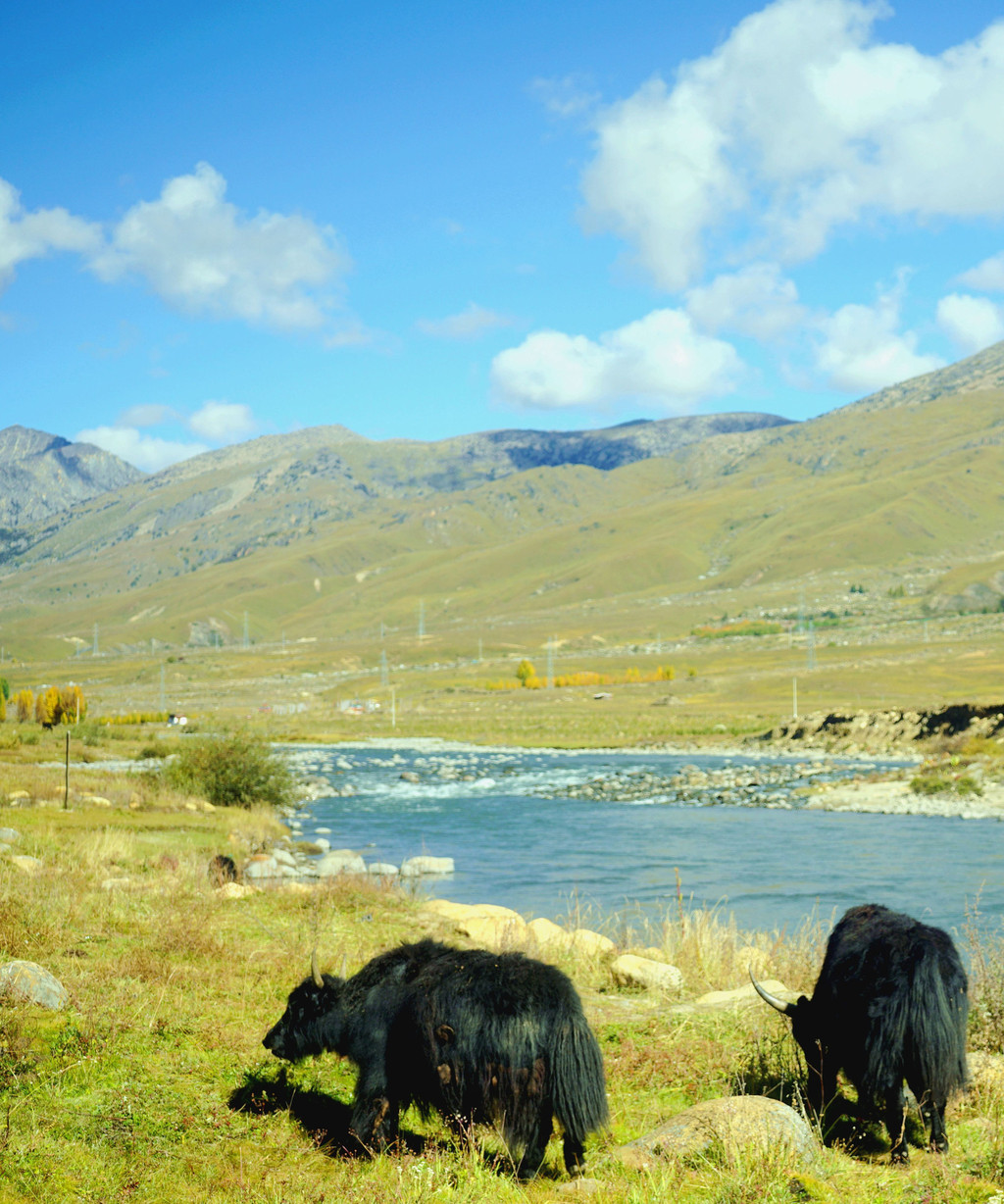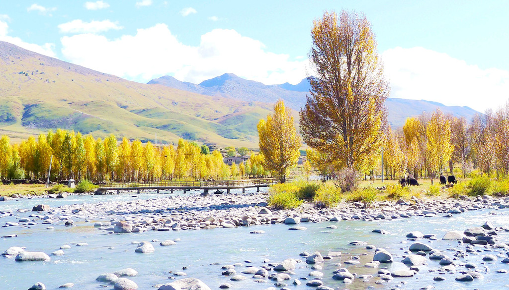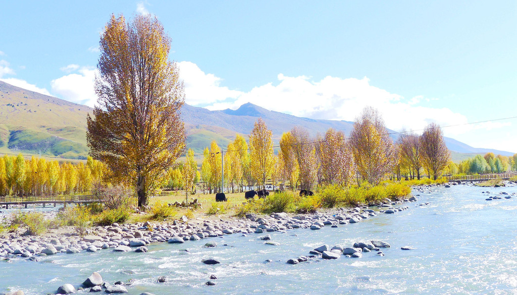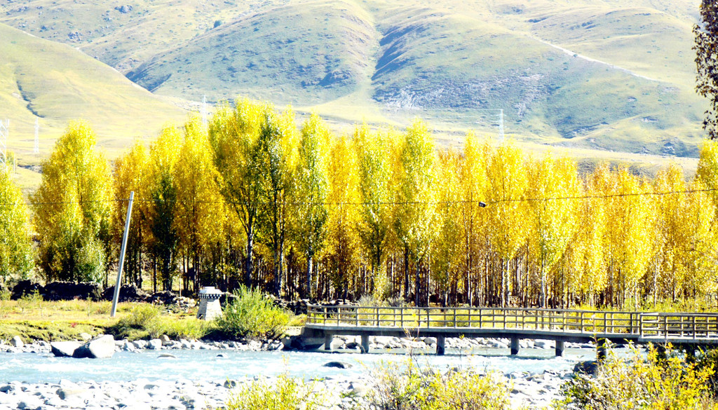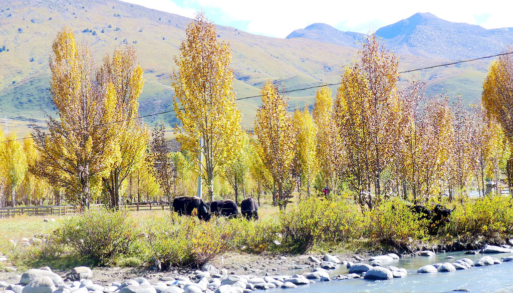 逗留大约十分钟后继续前行,公路右侧有条小河,时而远、时而近地始终与国道并行。她是当地母亲河,发源于“海子山”,流经稻城县城,最后是要汇入金沙江。10:32驶经一处宽阔的河湾,公路直抵河边,河畔设置停车场、观景台、还有木栈道。河水中央有两座小岛,弯弯曲曲的栈桥将小岛与两岸相连,河岸及小岛植被茂密,秋叶金黄,牦牛悠闲地吃草,秀丽风光堪比公园,我们又一次停车、逗留。