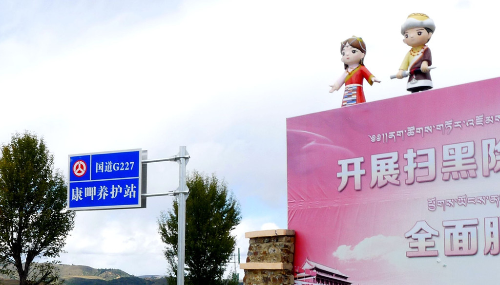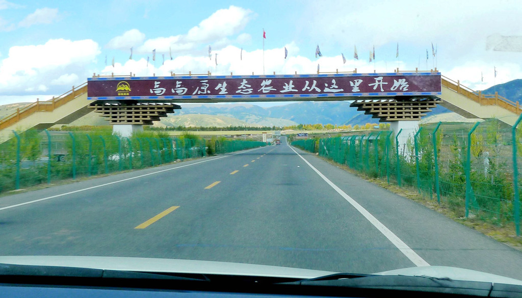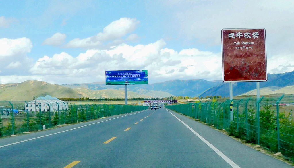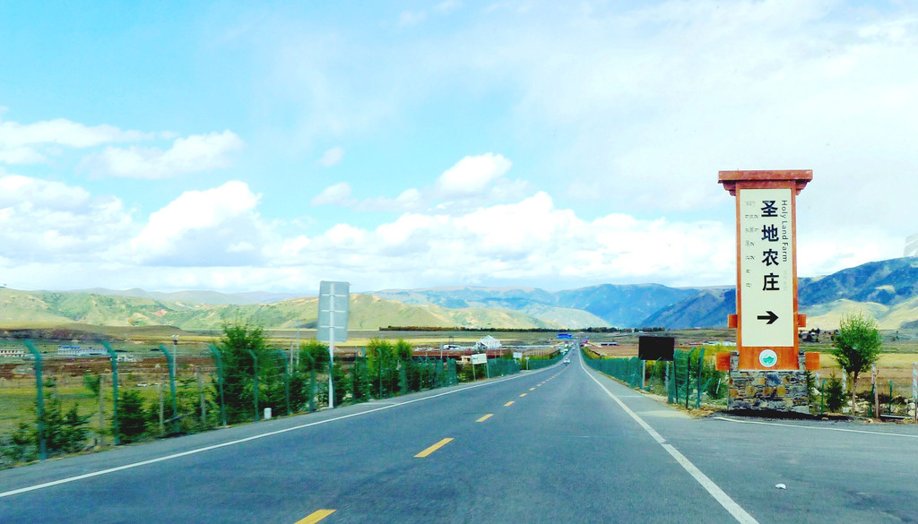 14:18登车再走,驶经辽阔的农田、牧场,田野中树立大字标语“全力保障粤港澳蔬菜安全”,另外也有标语显示,这里是国家对藏区的精准扶贫基地,要在此处大力发展高原生态农业。14:25驶经理塘河,看到草原上的一排白塔,再向前是一大片的放牧草场。14:35经过理塘县甲洼公安检查站,无人值守。