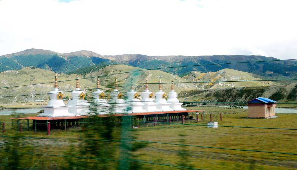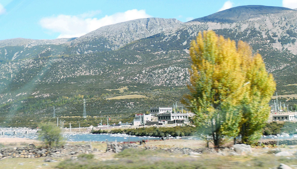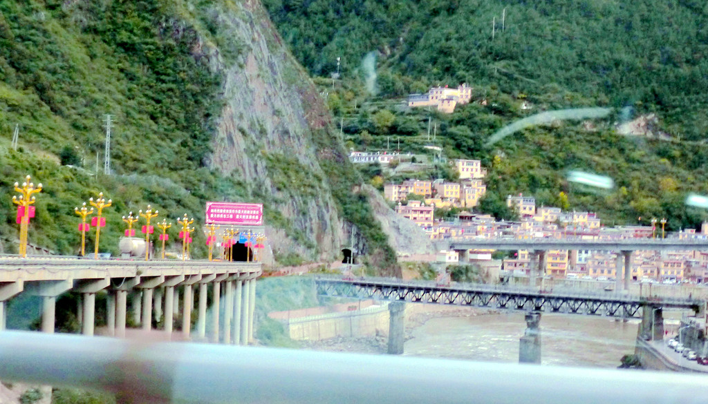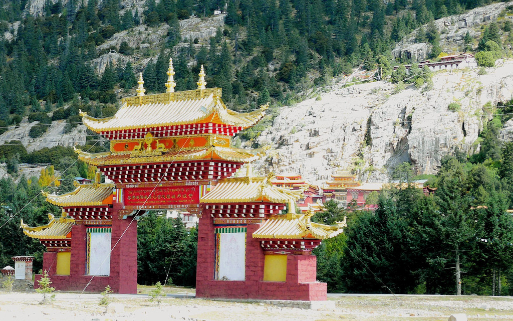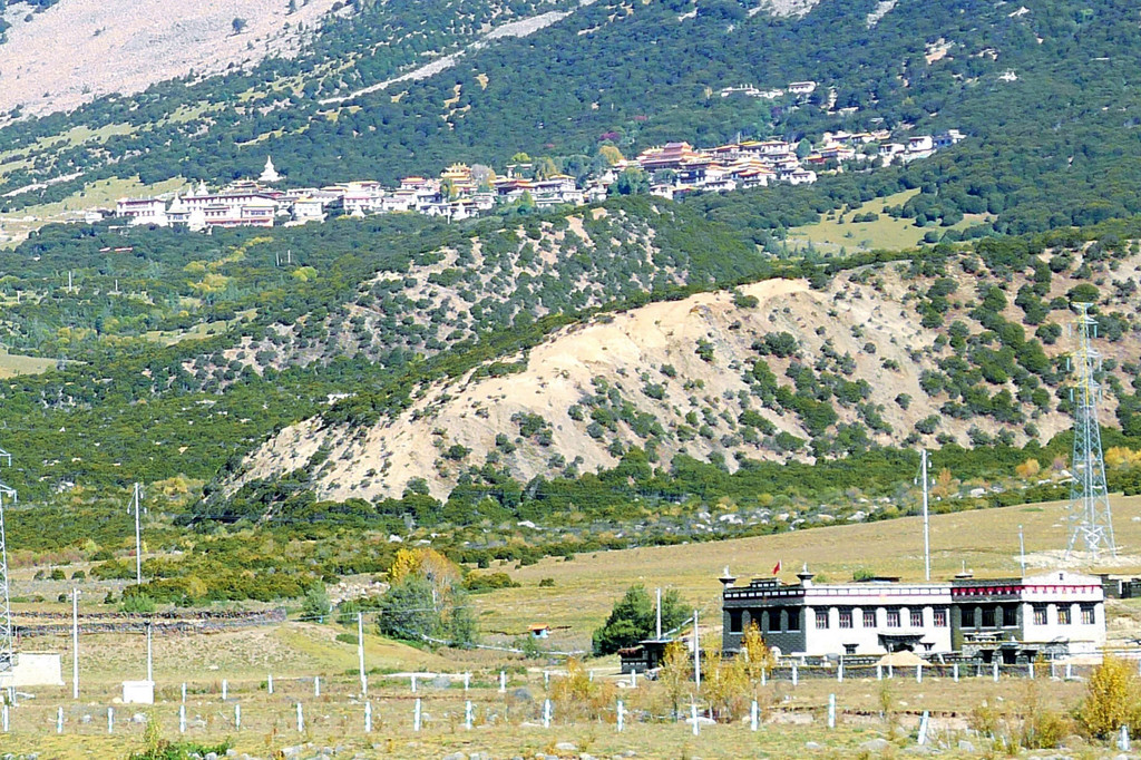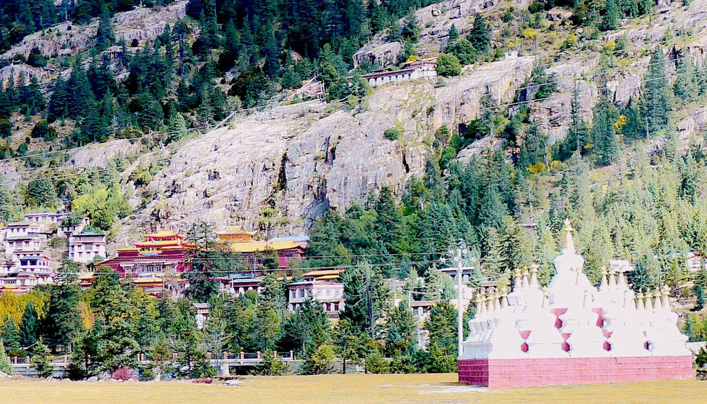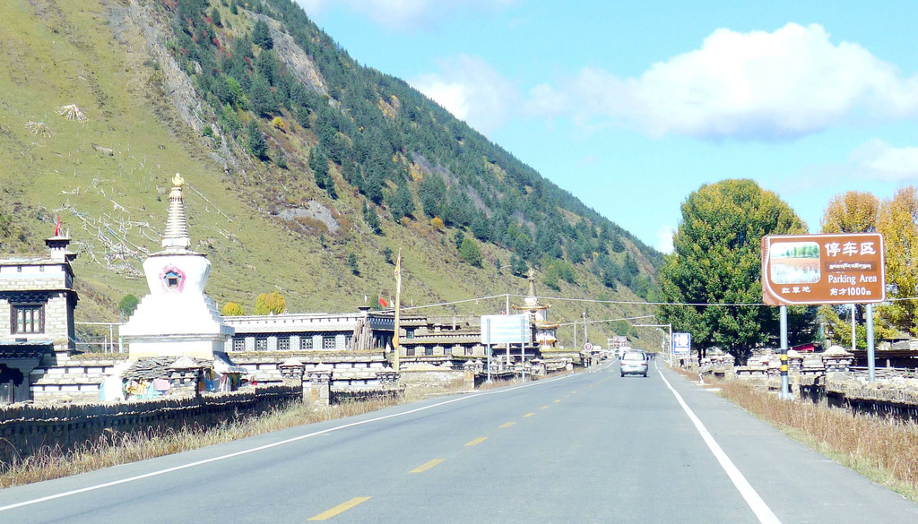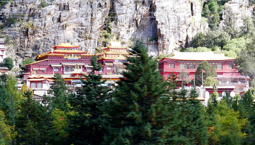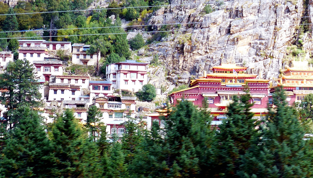 11:10驶经“桑堆镇”,我们没有停车,继续沿国道G227驶往理塘方向。11:13经过尚在建设中的“桑堆河谷观光台”,这里有两座金碧辉煌的寺庙,一座称“奔波寺”,规模较小,位于一面陡壁悬崖的崖顶,另一座规模较大,称“蚌普寺”,建造在悬崖脚下,X.J.对寺庙不感兴趣,我们没有停车,又是直驶而过。