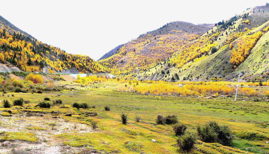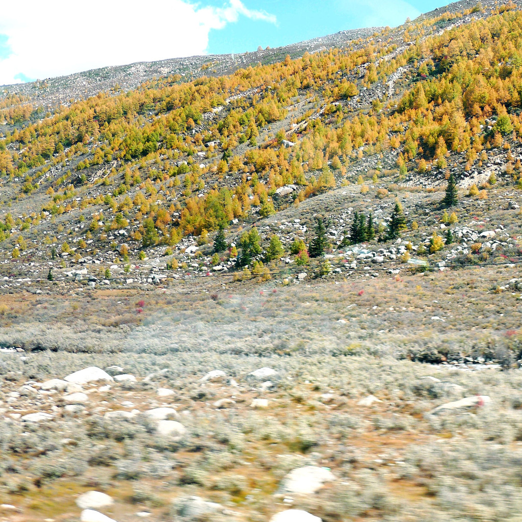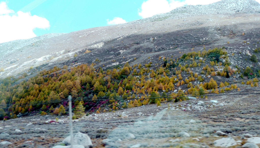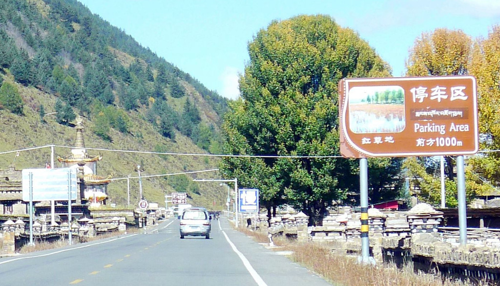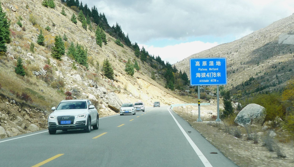 13:35继续前行,汽车一路下山,山坡上开始出现树木,平地上也开始出现大面积的草丛,路边有块牌子表明,这里是海子山上的高原湿地,海拔4178米。高原地带的金秋,草甸、灌丛和部分阔叶林木都已变色,唯独针叶的冷云衫等树种仍然保持翠绿,各种颜色参杂,相比刚才兔儿山的荒凉,更显这边风景独好。
