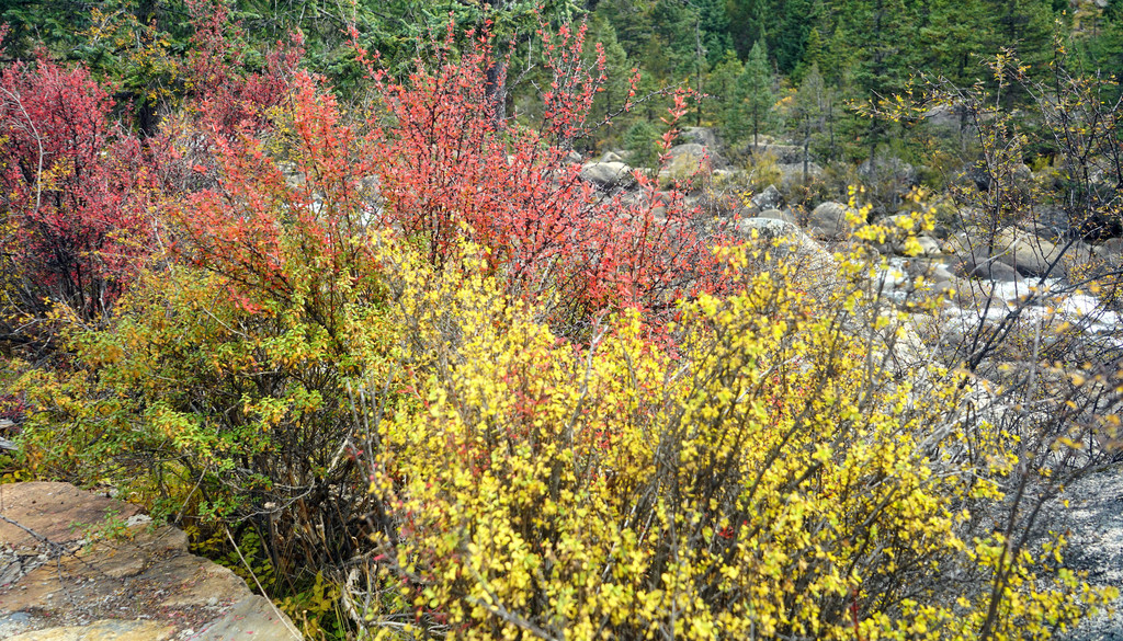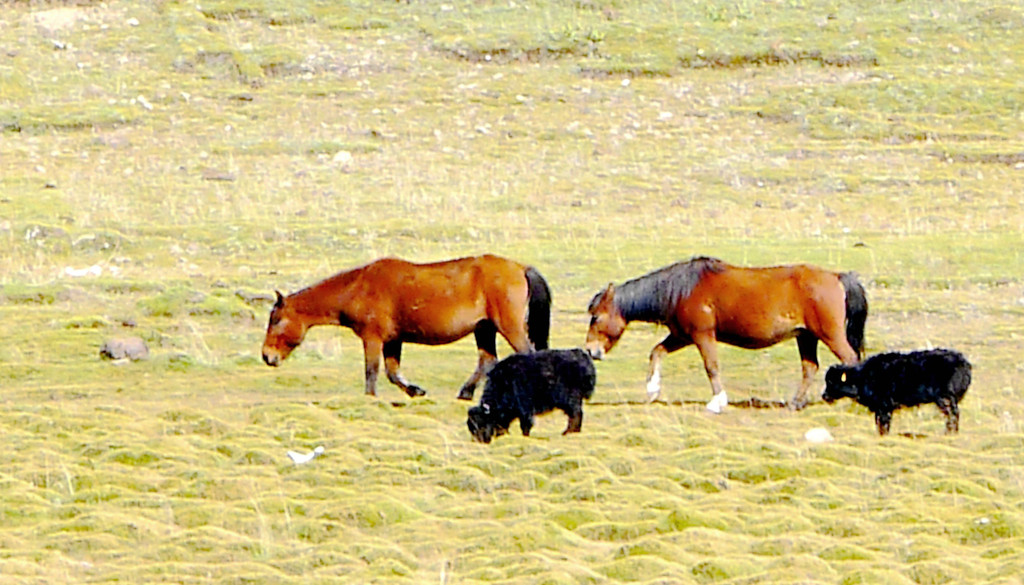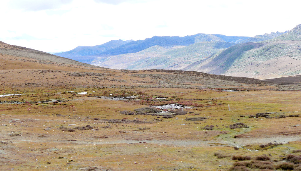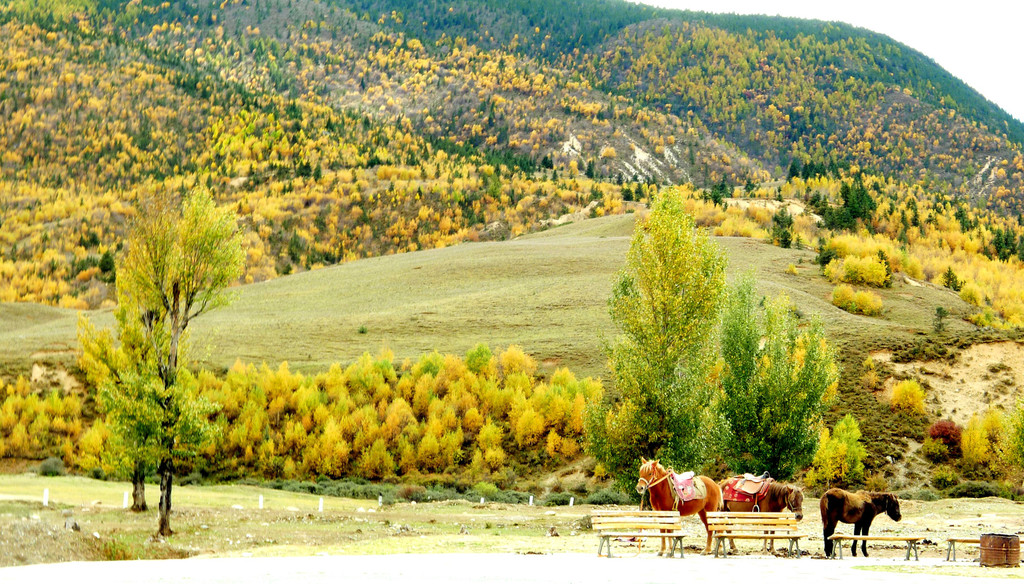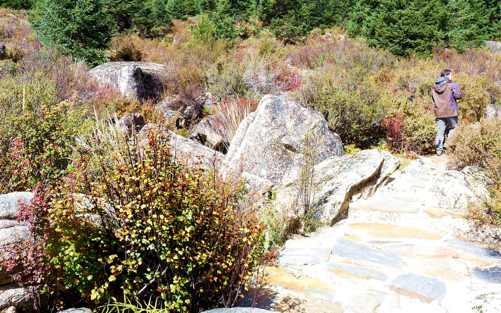 13:35继续前行,汽车一路下山,山坡上开始出现树木,平地上也开始出现大面积的草丛,路边有块牌子表明,这里是海子山上的高原湿地,海拔4178米。高原地带的金秋,草甸、灌丛和部分阔叶林木都已变色,唯独针叶的冷云衫等树种仍然保持翠绿,各种颜色参杂,相比刚才兔儿山的荒凉,更显这边风景独好。