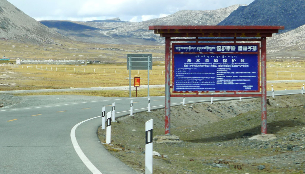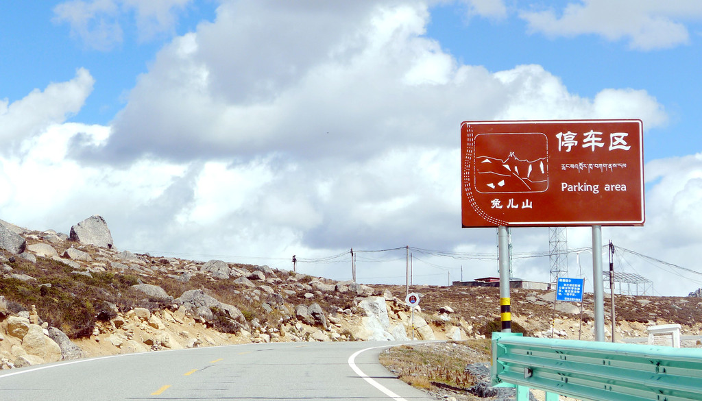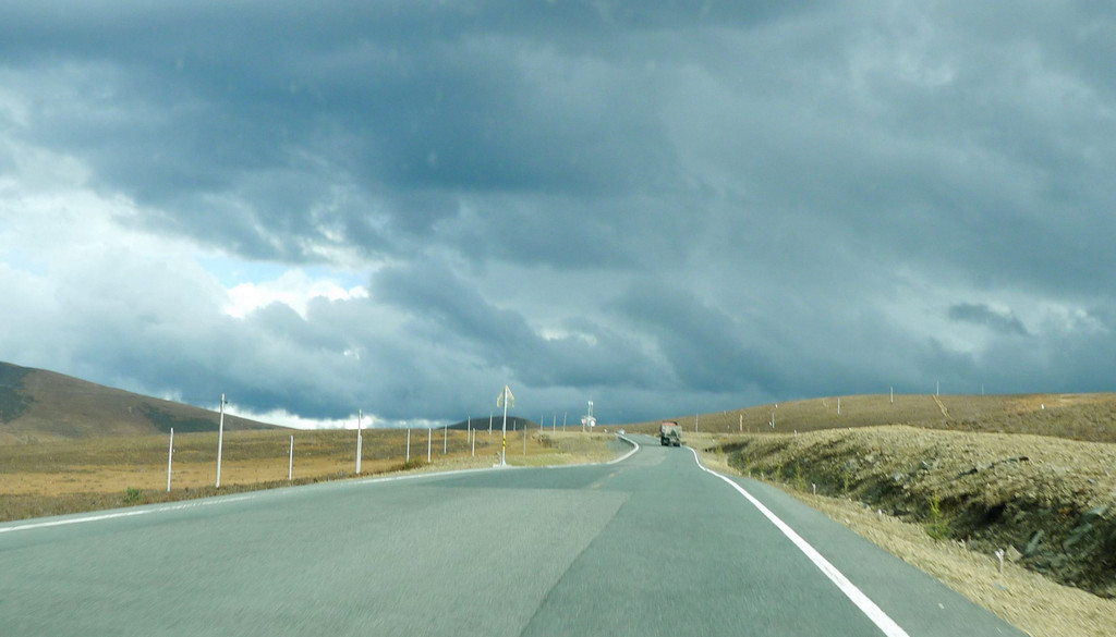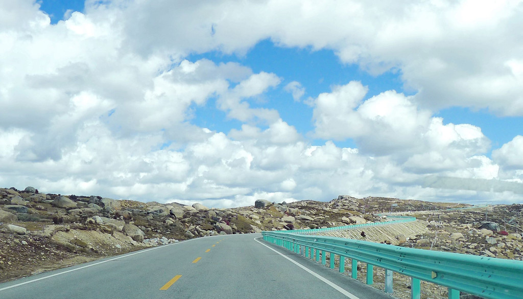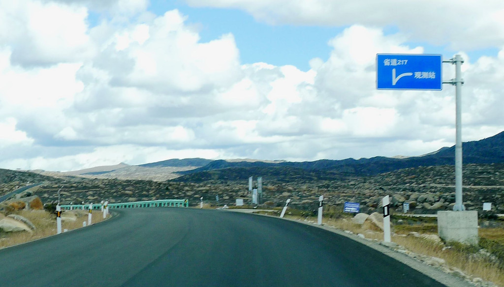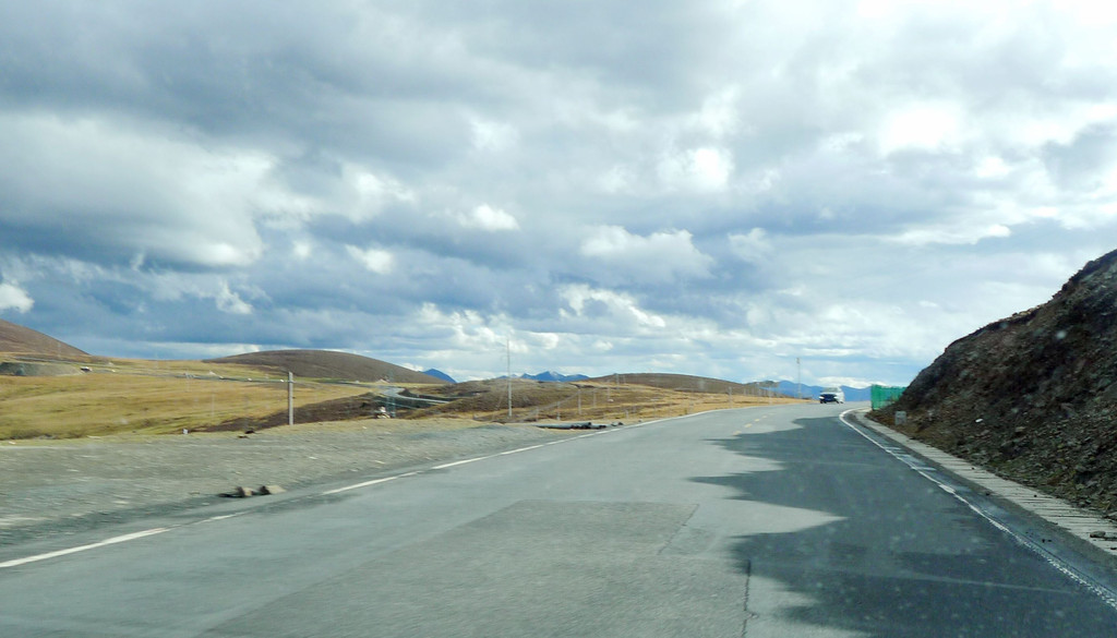 一路下山,天空开始放晴,公路是建造在高高的山梁之上,视野非常开阔,或许是因为海拔高的缘故,周边山坡全都是光秃秃的,看不到一颗树木。16:54驶经“尼玛贡神山大型观景台旅游服务区”,与刚才的卡子拉山相比,这里是一处设施相当完善的旅游服务区,有长列的房屋与相当正规的停车场,然而,我们从公路上看过去好似并没啥风景,于是就没有停车,直驶而过。