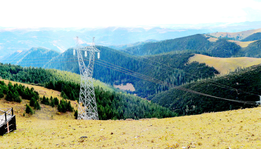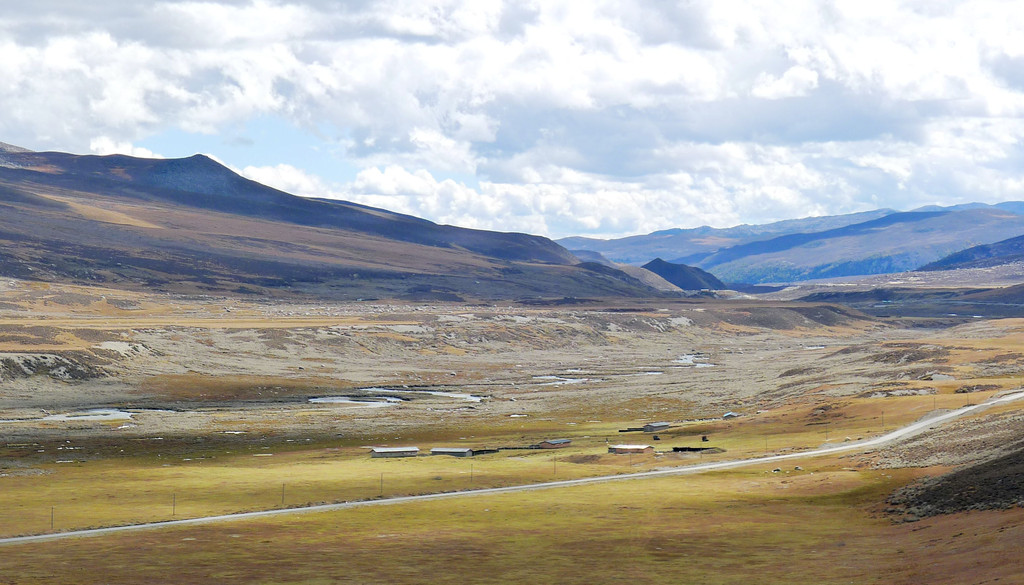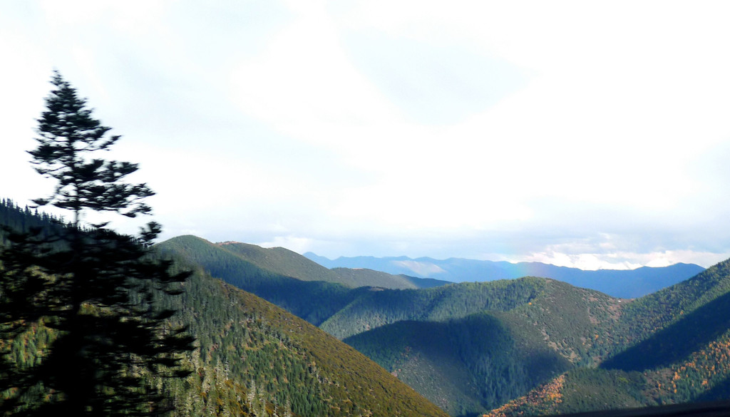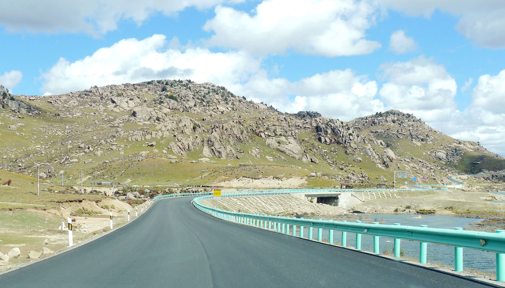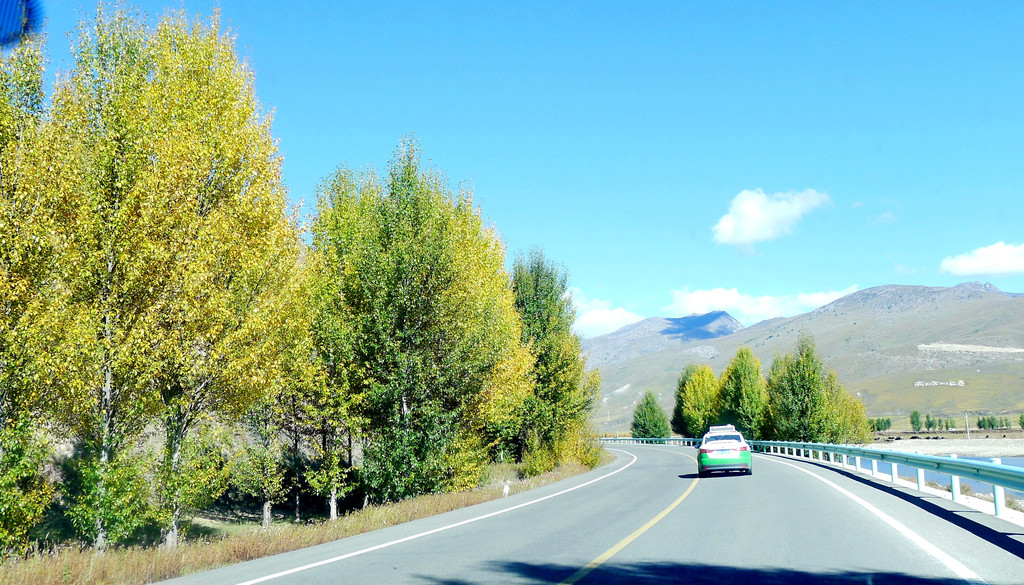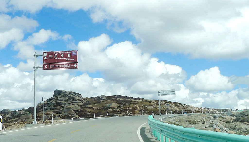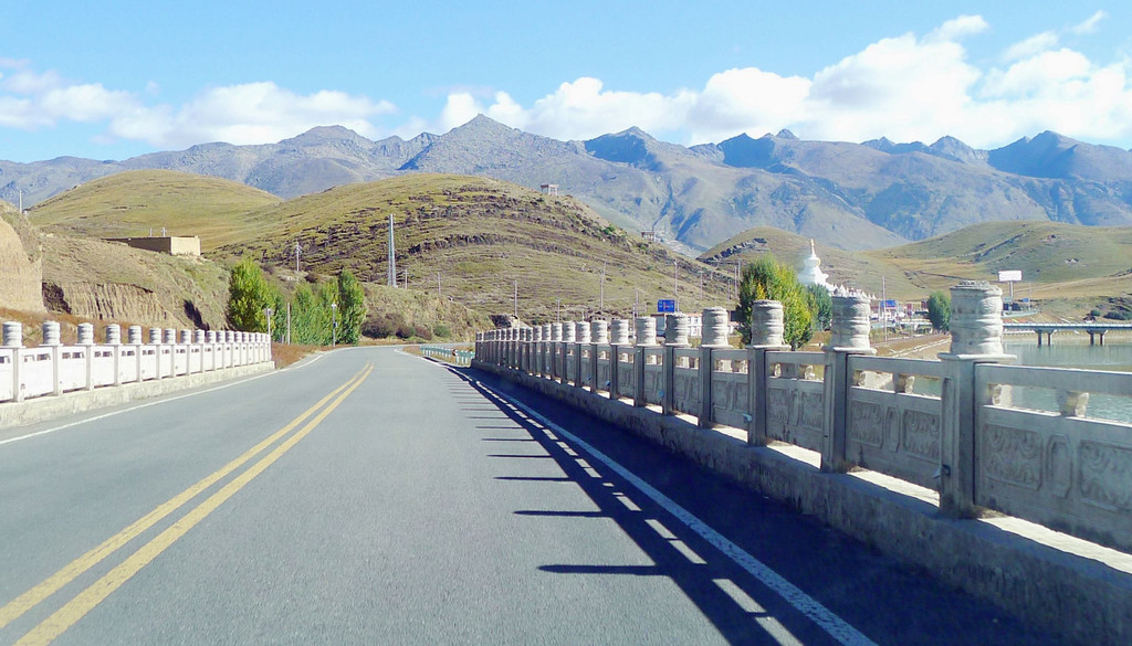 一路下山,天空开始放晴,公路是建造在高高的山梁之上,视野非常开阔,或许是因为海拔高的缘故,周边山坡全都是光秃秃的,看不到一颗树木。16:54驶经“尼玛贡神山大型观景台旅游服务区”,与刚才的卡子拉山相比,这里是一处设施相当完善的旅游服务区,有长列的房屋与相当正规的停车场,然而,我们从公路上看过去好似并没啥风景,于是就没有停车,直驶而过。