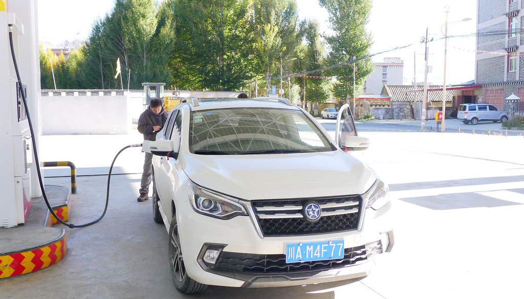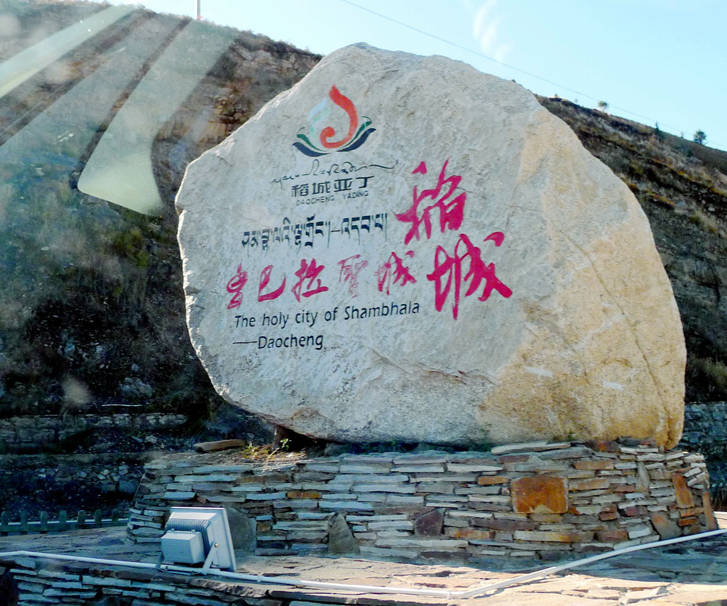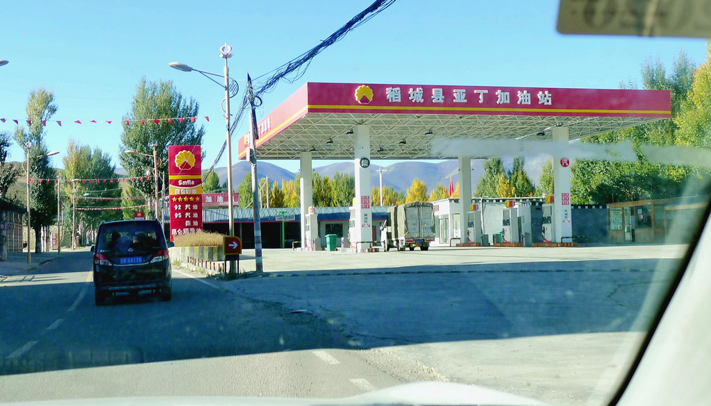 10月11日(D8),昨日傍晚从亚丁景区来到稻城县城(金珠镇),入住城区“圣地映像”酒店,今日的计划是从稻城折返雅江,相比于三天前从新都桥过来,入住香格里拉镇的行程,今日应该轻松得多,因为少走两段路:前面少了(香格里拉镇→稻城)这一段,后面又去掉了(雅江→新都桥)这一段,因而,我对日落前能够赶到雅江信心满满。时间比较宽裕,晨起也就较迟,8:33方才下楼去吃早餐,9:20退房出发。酒店附近有座“青杨林观景台”,出发后决定先去那里看看,行至半路看到“稻城县亚丁加油站”,停车加油。9:34驶抵青杨林观景台下,停车场旁有块巨石,题刻“稻城 香巴拉圣城”。