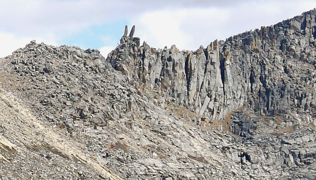 继续前行,冰盖遗迹消退,我们路过一片草原,路边告示牌显示这里是“基本草原保护区”。过了草原又开始爬山,眼前景观又发生了巨变,荒凉的山坡上满眼都是大大小小的破碎石块。13:16抵达兔儿山,山顶垭口设置“停车服务区”,眼前的山峰全为石质,山体好像是曾被某种神秘力量“刀劈斧砍”,漫山都是高大的岩柱,岩柱崩塌、碎裂,又变成巨石,堆满整面山坡,我怀疑这些也都是古代冰川的作为。