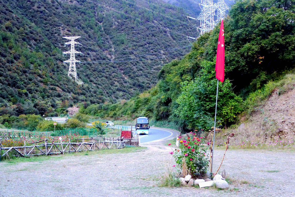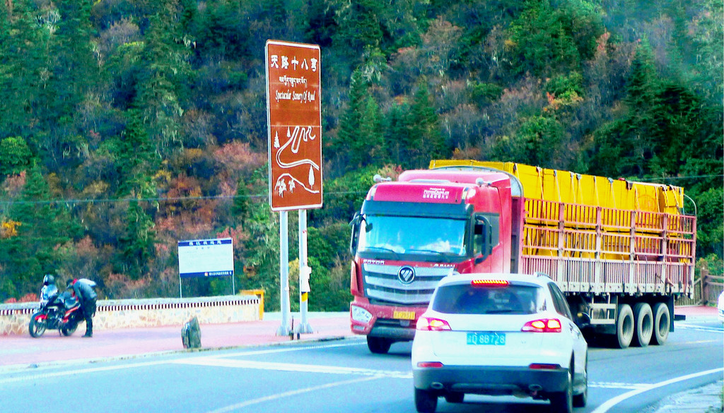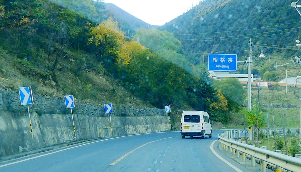17:27驶出洞口,立马就是川藏线上著名的“天路十八弯”险段,出洞后行驶大约500米,突然发现有处“天路十八弯旅游综合服务站”,但因我们是行驶在下行车道上,服务站位于上行车道路边,对面来车一部接一部,我们错过了进入服务站的机会。继续下山,17:33又突然看见路边有处“天路18弯观景台”,然而,同样也是因为我们下山车速太快,对面正好有大车上山,我们错过了进入观景台的机会。17:42驶抵山下“相格宗村”,这里海拔3600米,天路18弯路段到此结束。