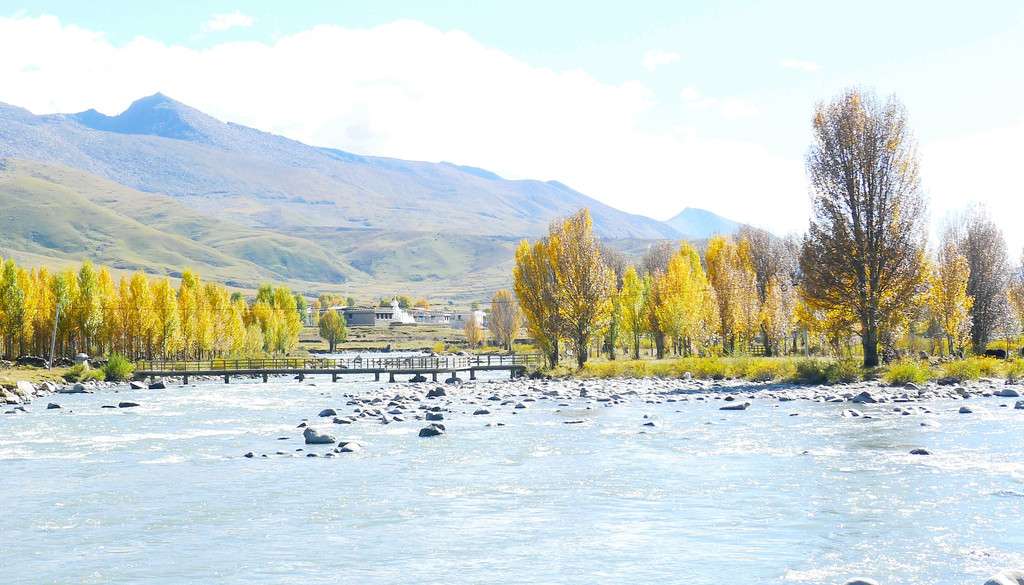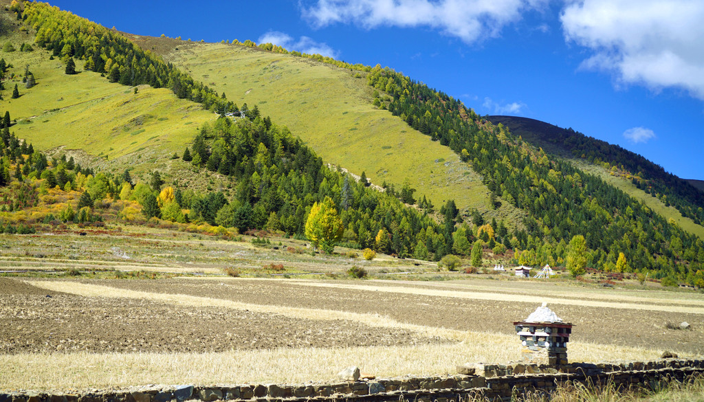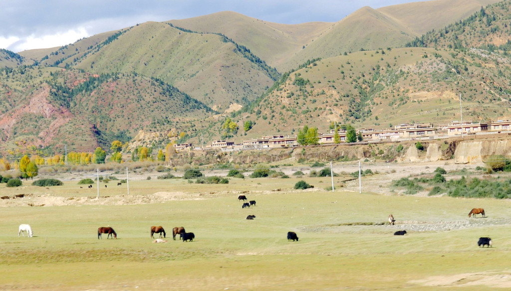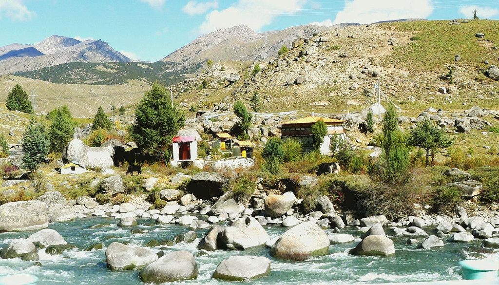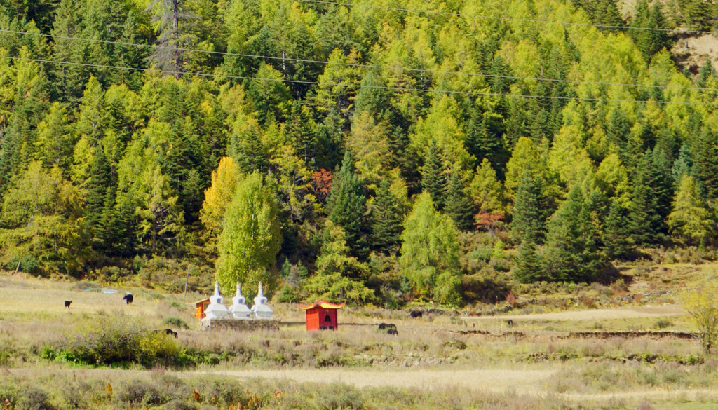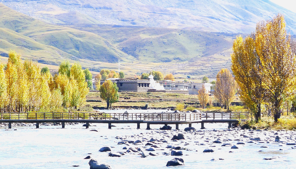 继续沿小河溯流行驶,沿途景色绮丽,既有佛塔、藏舍,也有小桥流水、田园、牧场,让我想起十多年前尚未大肆商业开发的“新都桥摄影家天堂”。