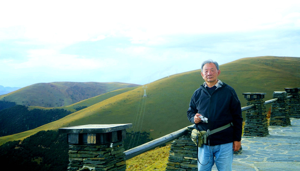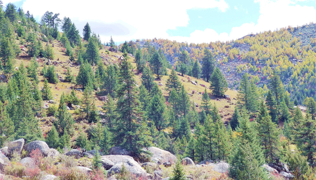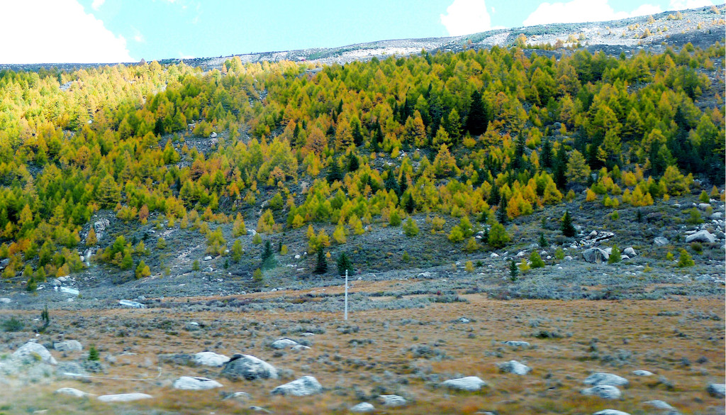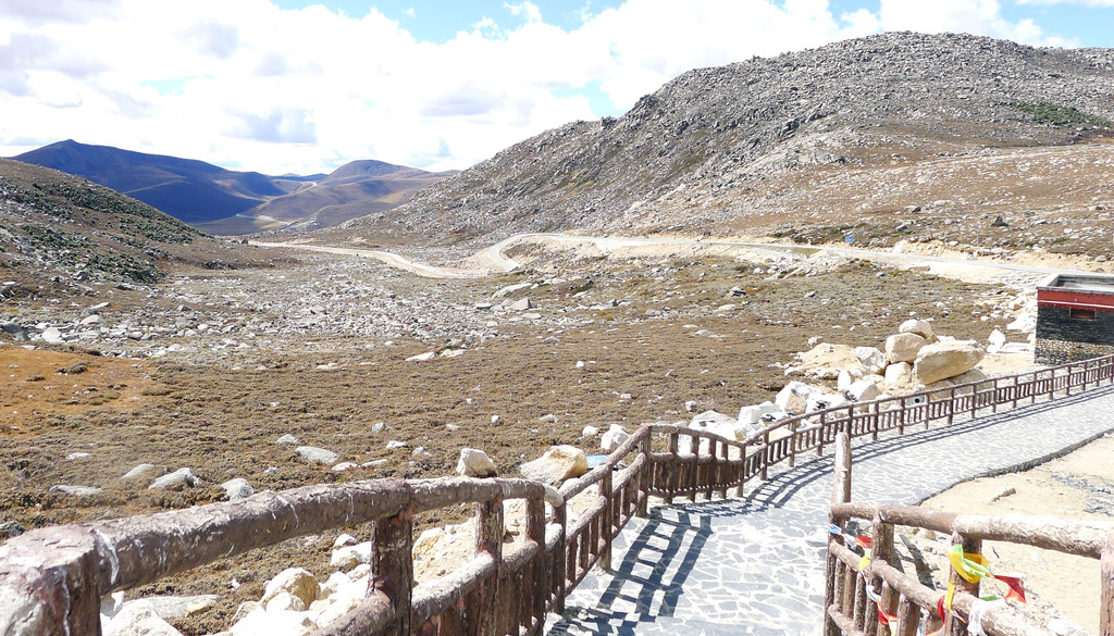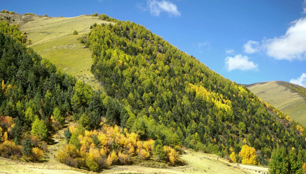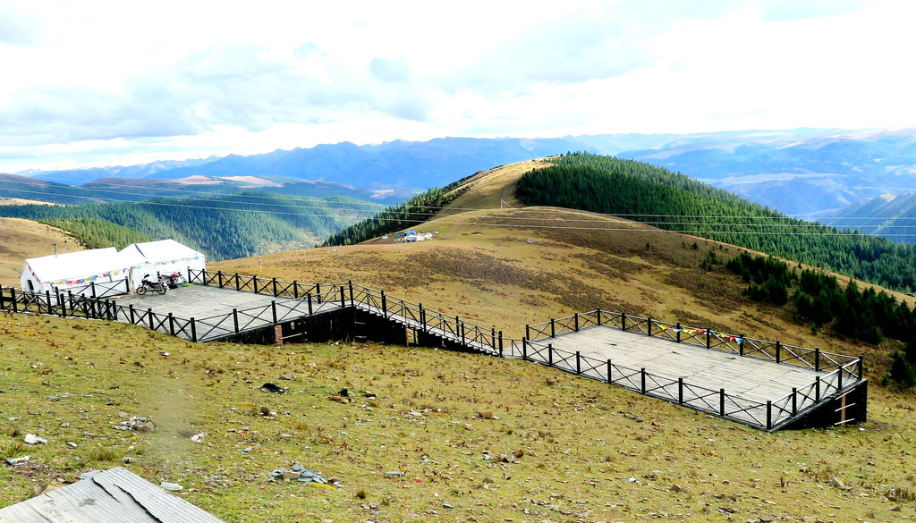 继续前行,海拔逐渐下降,山坡上也开始有大片的林木现身。16:59突然看到右侧路边有座的木构观景台,于是停车。这里叫做“俄拉东果”,观景台是处于山顶草原与山坡针叶树林相互交接的位置,从观景台下去就可以直接走入山顶草原,估计春季花开时刻这里应该景色甚美,不过此刻季节不对,我们只是逗留了一会儿,拍了几张照片,然后就继续前进。