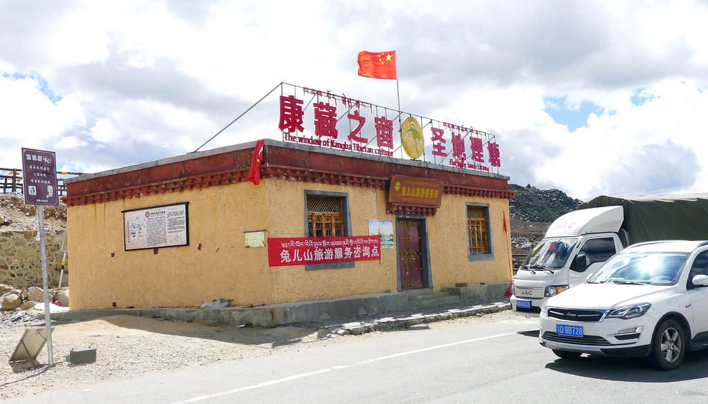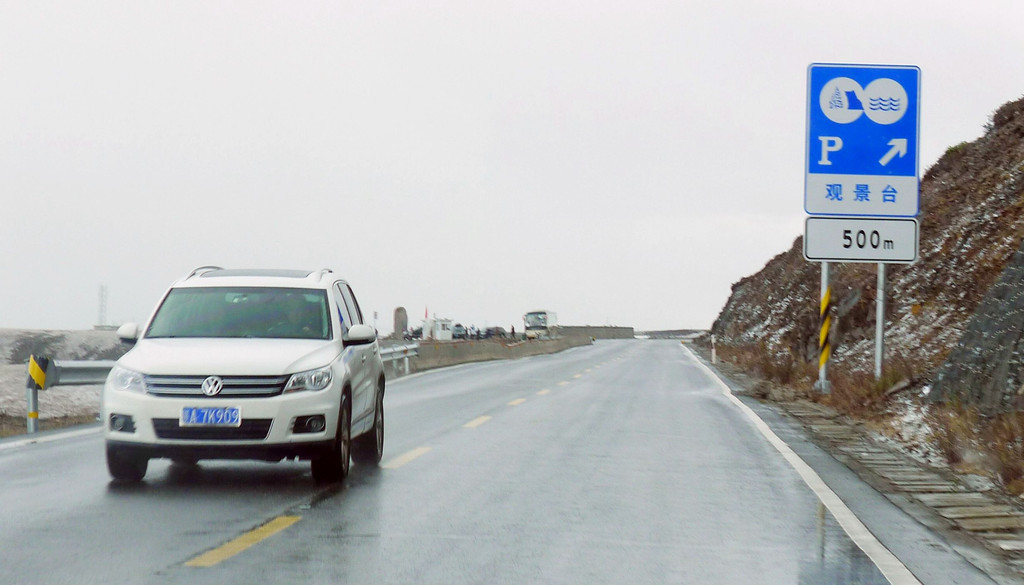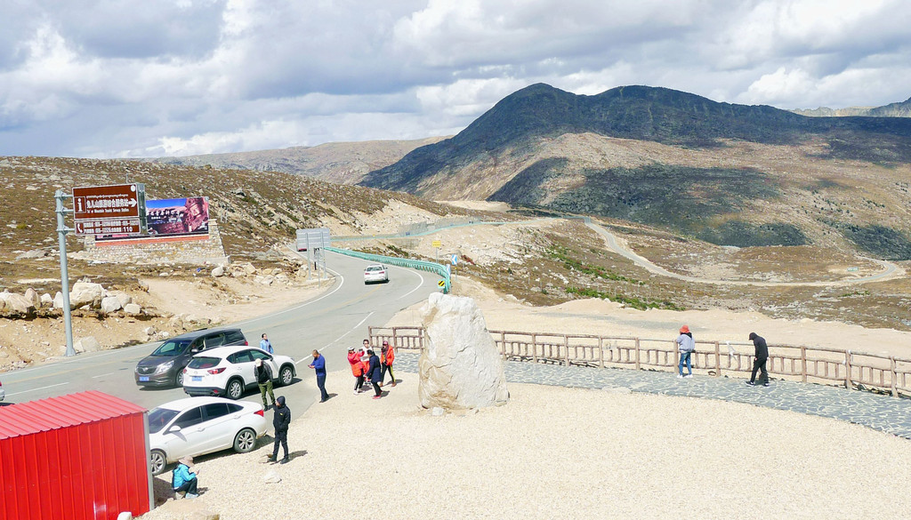 驶出红龙镇后不久开始翻越“卡子拉山”,它也是横亘在川藏线上的一座大山,至今未建隧道,必须翻越垭口。16:23驶抵卡子拉山垭口,这里有面积颇大的观景台,然而,除去一处公厕和一座巨大石碑,其他什么设施都没有。风大气温又低,雨后朦胧也看不到风景,拍了两张照片,然后就匆匆登车,再次出发。