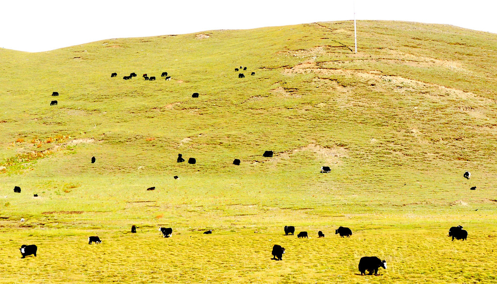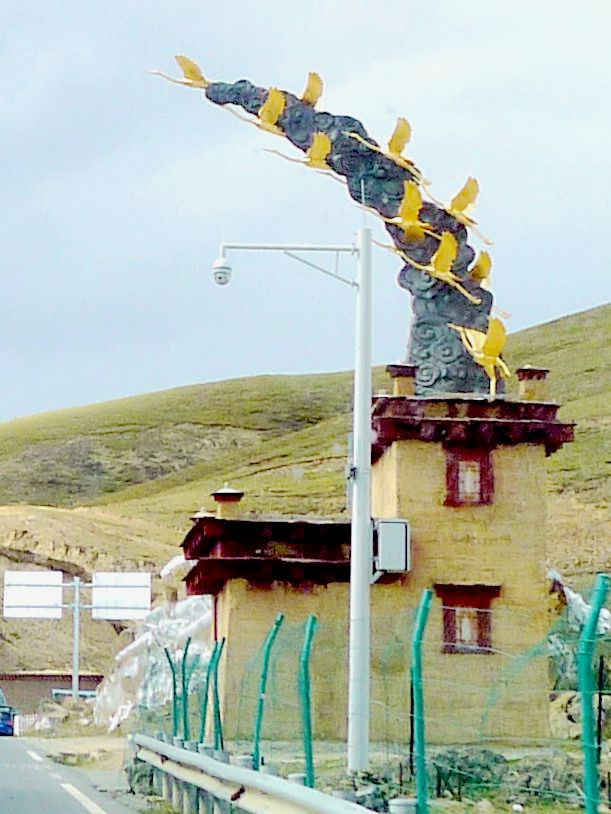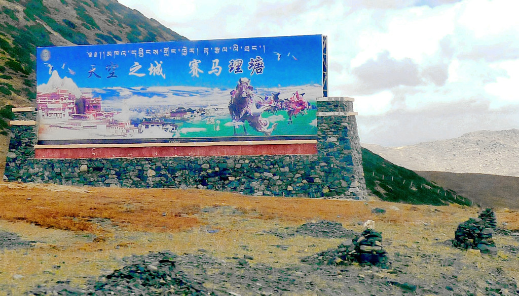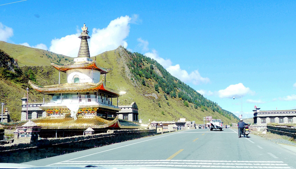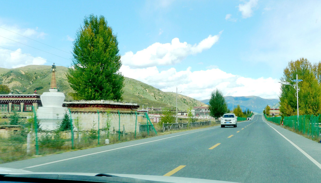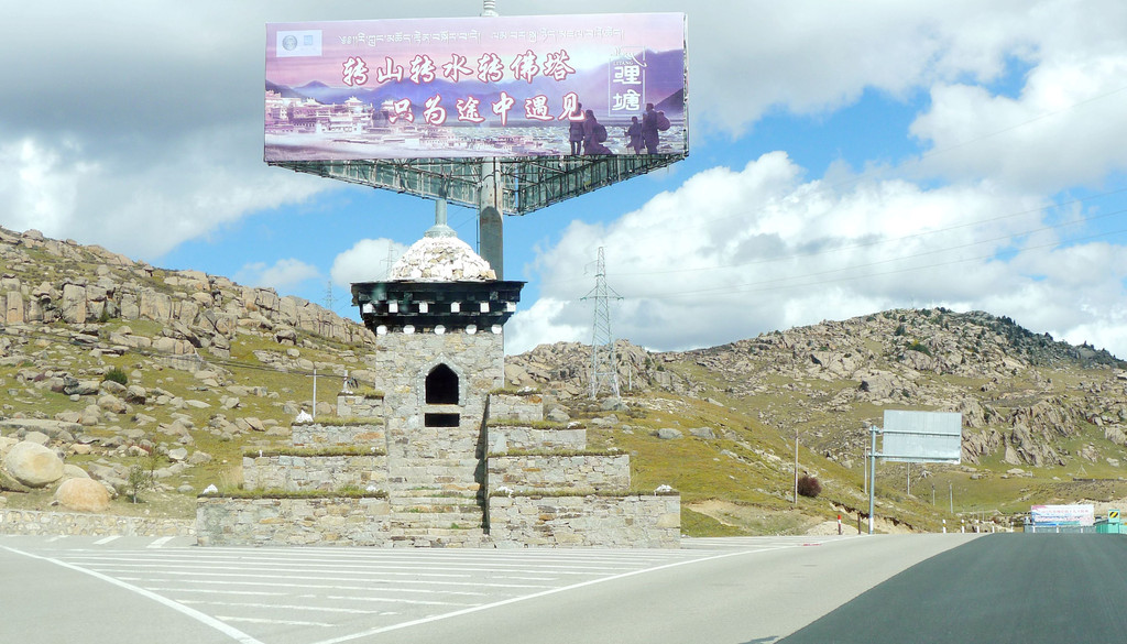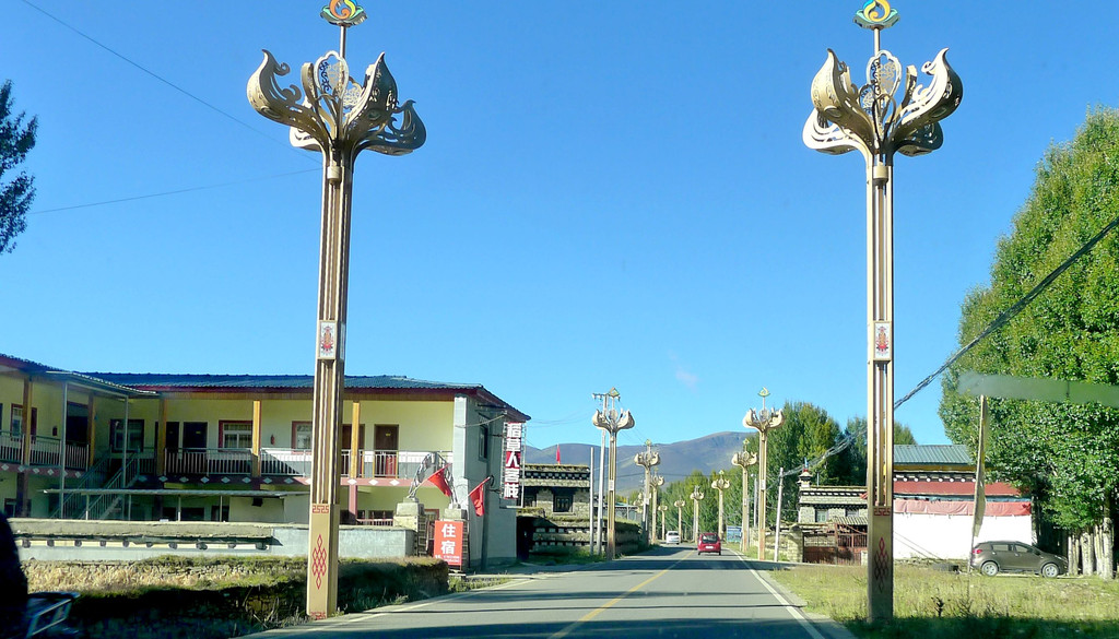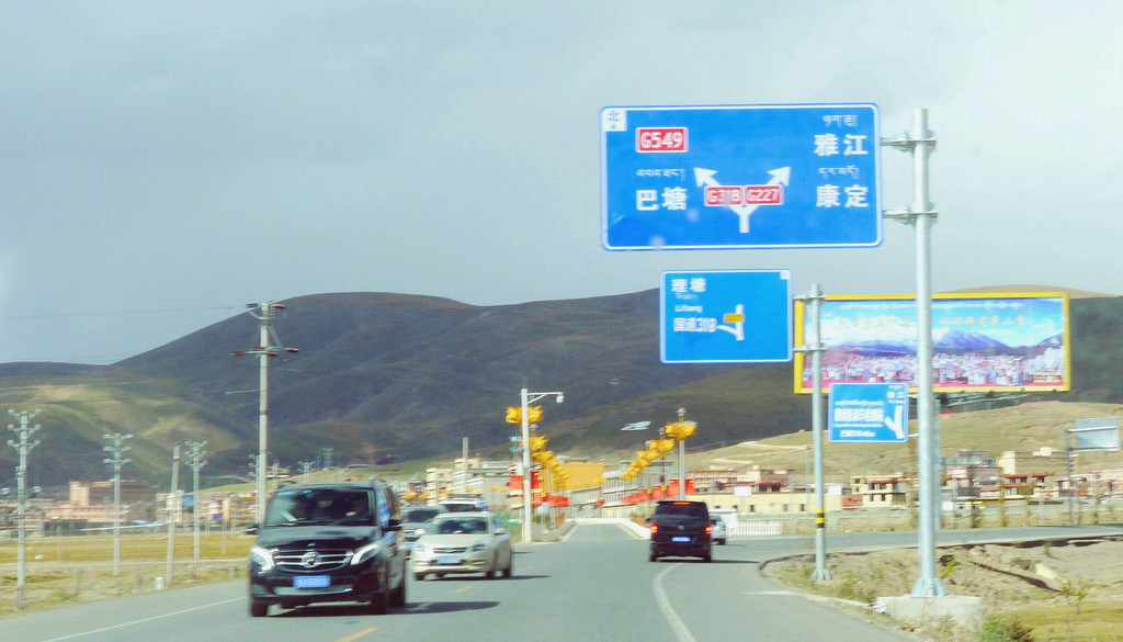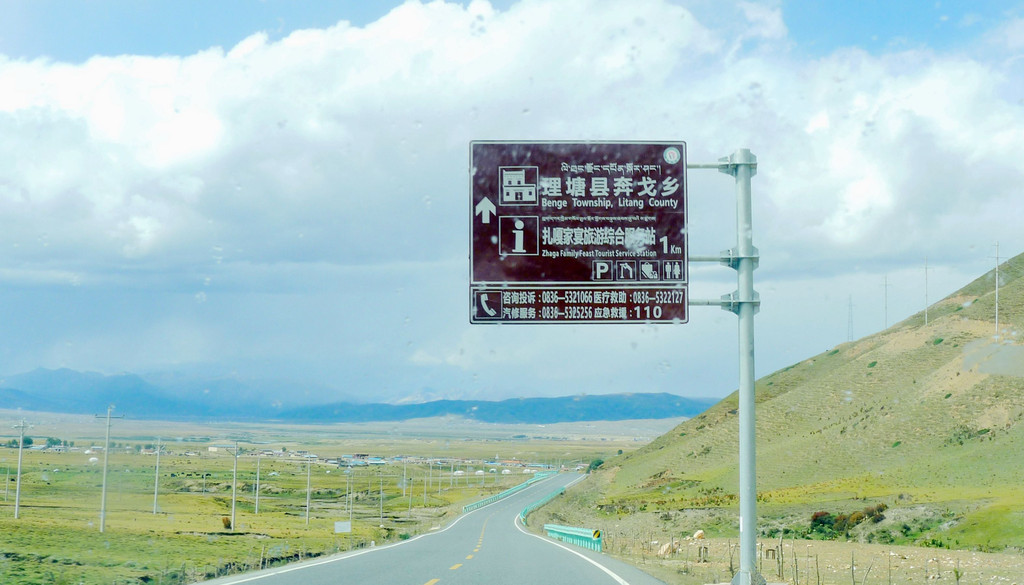 14:50爬上一座小山包,这里被称为“扎嘎神山”,山顶(海拔4130米 )上有座寺庙。过了小庙就是下山,山下是理塘县的奔戈乡,又是一马平川,广阔的牧场。15:05驶抵理塘县三岔路口,从这里直行是进入理塘县城,我们右拐,绕过县城,15:08驶抵一座有牛角、飞鹤标志的大门,穿门而过再右拐,上国道G318,驶往雅江方向。