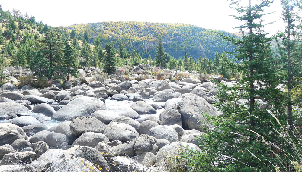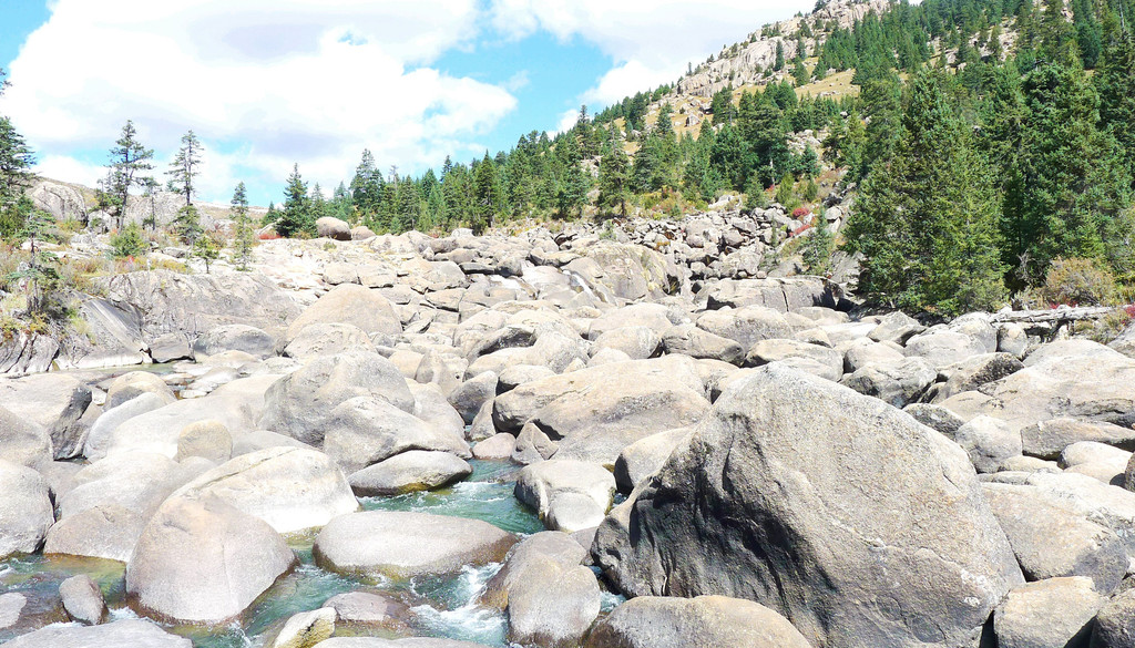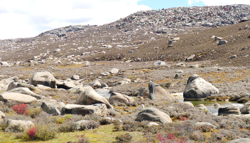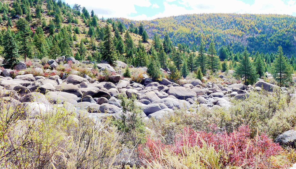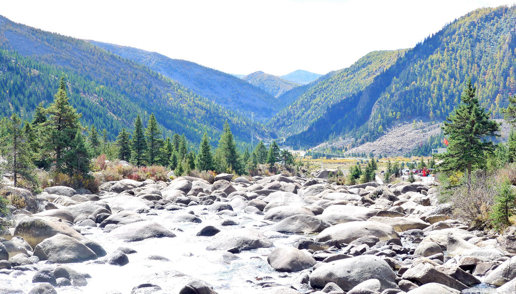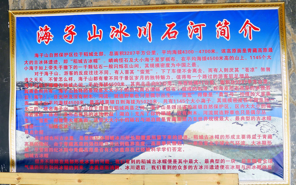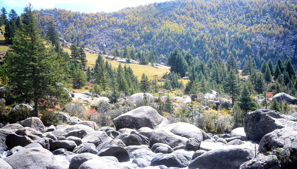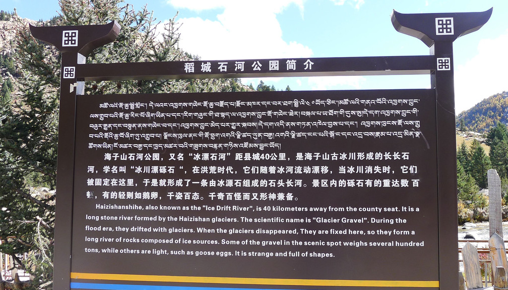 11:27抵达“海子山”脚下,这里有座“石河公园”,免费开放,两天前路过这里没停,今日算是补课。公园又称“冰漂石河”,距离稻城县城40公里,它是海子山古代冰川的遗迹,也是一条河床里填满了大、小石块的长长河道。这些石块学名称“冰川漂砾石”,它们是在远古年代随着冰川的移动、漂移来到这里,后来气候变暖,冰川消失,大大小小的漂移石块被遗弃、固定在这里,于是就形成了眼前这么一条由冰源石组成的石头长河。河床上的石块有的重达百吨,有的又轻如鹅卵,姿态千百,堪称奇观。