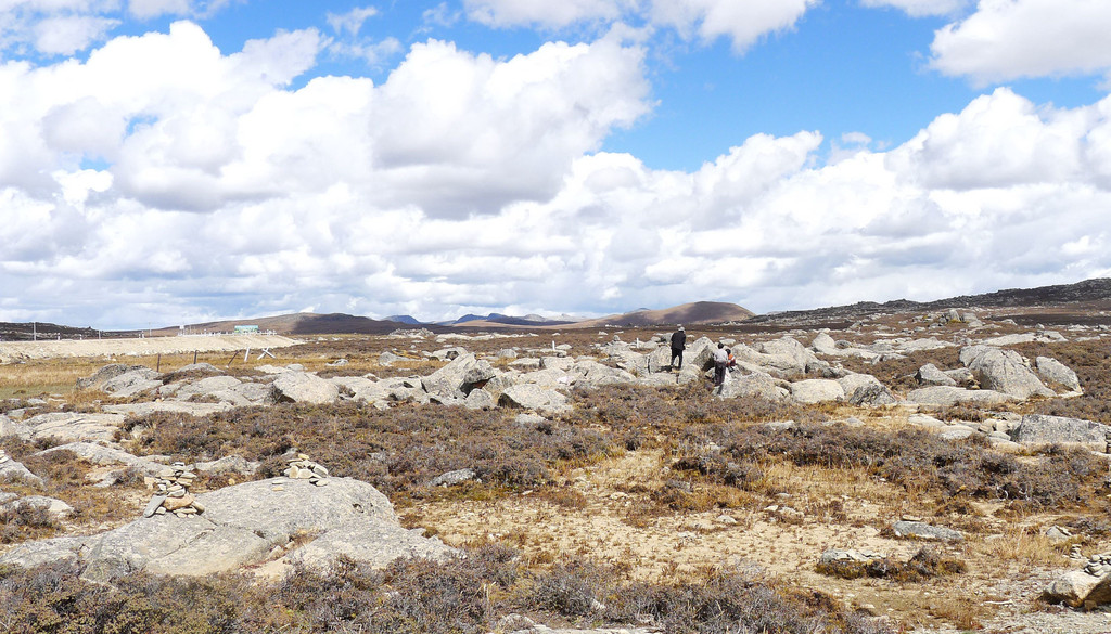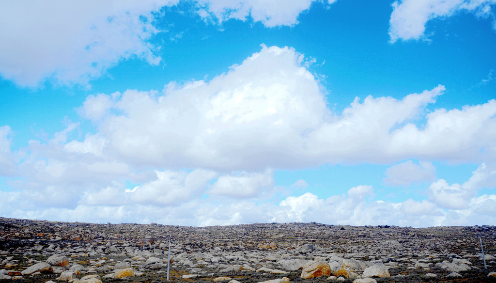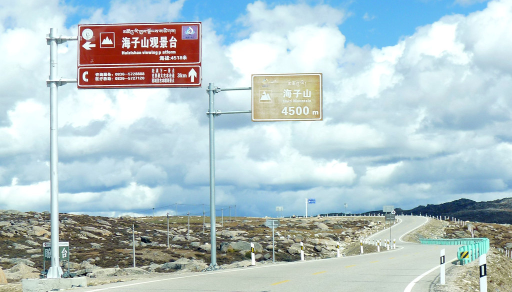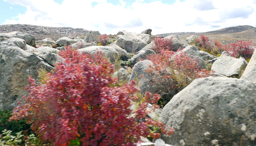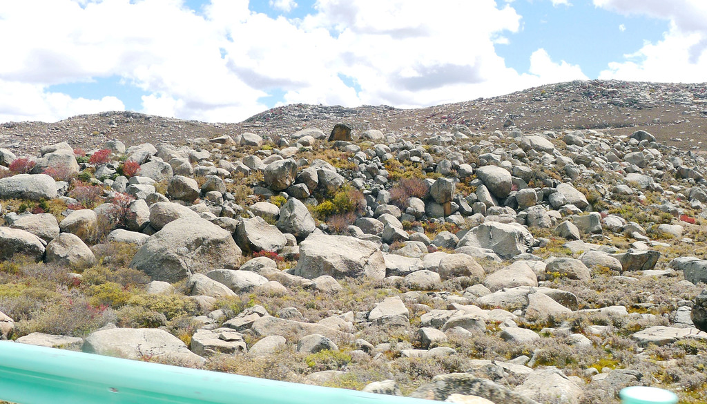 12:24再次出发,五分钟后驶经机场三岔路口,三角形的路口正中有座藏塔,左转是通往“稻城亚丁机场”,我们沿右侧直行,继续驶往理塘。随即就是“海子山自然保护区”,总面积3287平方公里,平均海拔4300-4700米,嶙峋怪石与大小海子星罗棋布,它是青藏高原最大的古冰体遗迹,称为“稻城古冰帽”。因为在平均海拔4500米的高山顶上散落着1145个大、小海子,故而山称“海子山”。汽车一路爬升,巨石与海子接连不断地出现在路边,呈现在我们眼前。
