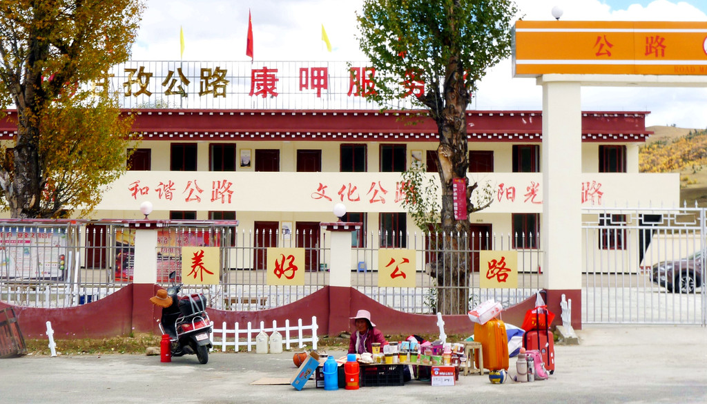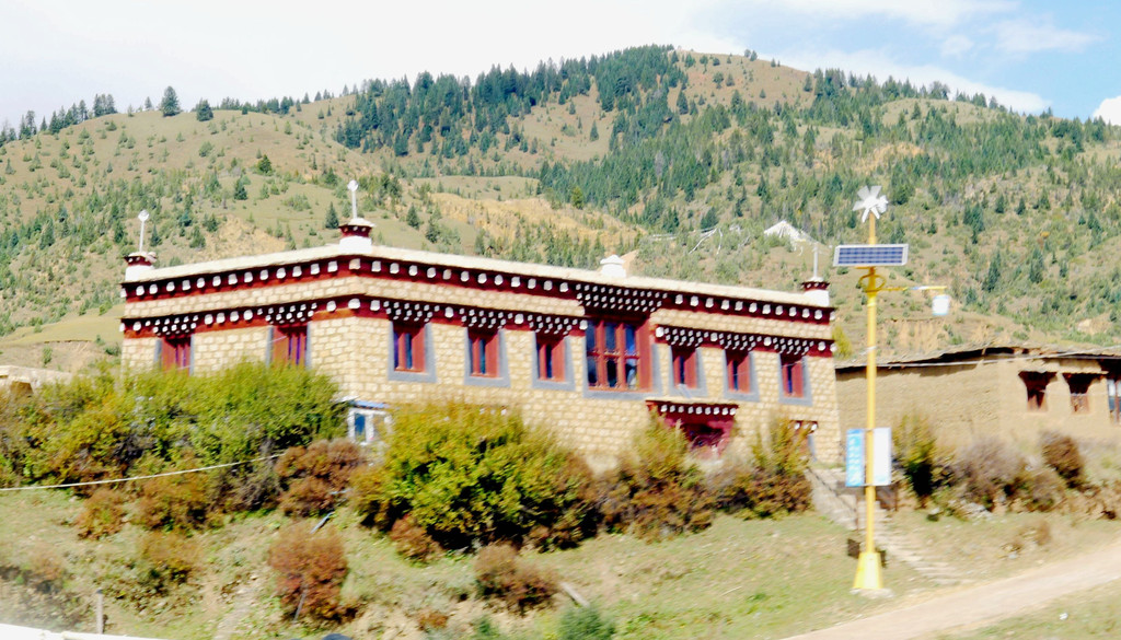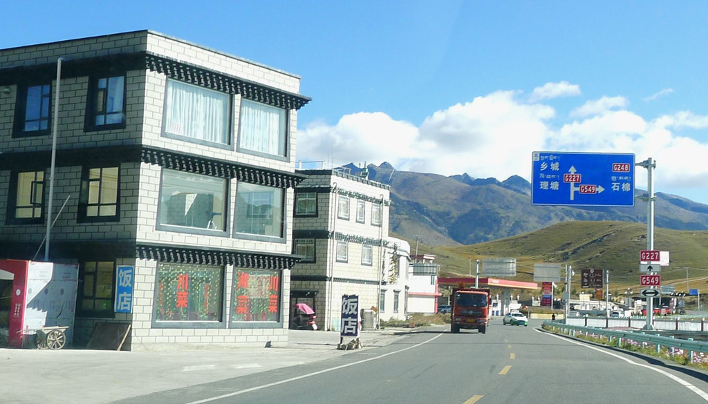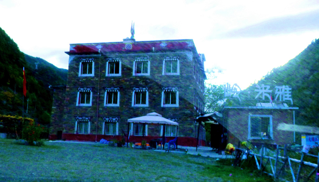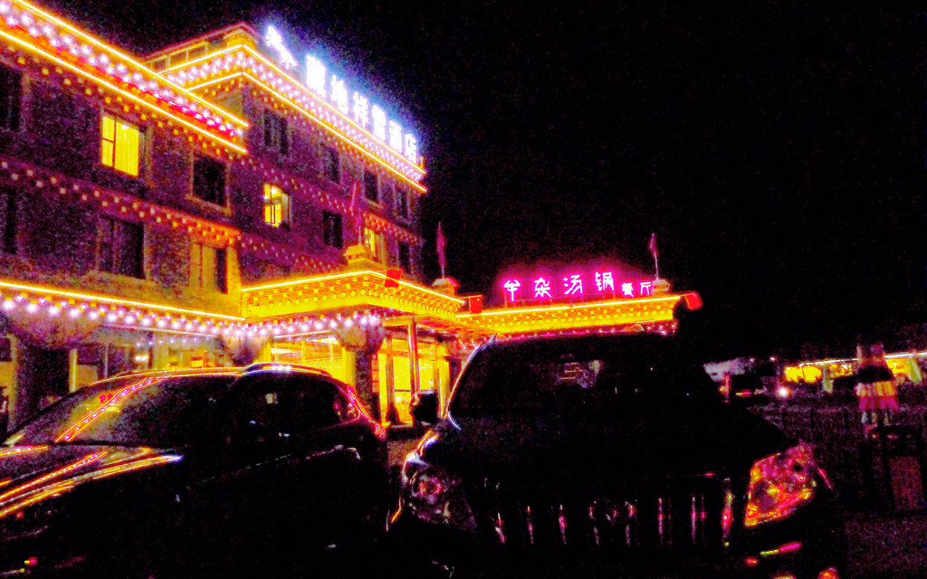 继续前进,周边环境越走越偏僻,导航也持续报告“距离目的地还有15公里、10公里、5公里”。我再次质疑怎么会离县城这么远?X.J.不耐烦地回应“远离县城又有何妨”,我见他牛脾气上来,也就不再说话。18:30来到一处前不着村后不着店的地方,路边有一独幢楼房,导航终于说出:“到达目的地附近,本次导航结束”。我们驶入院内,却是无人理睬,X.J.下车喊话,方才出来一位看门老人,告诉我们酒店现时可以入住,但不提供膳食,吃饭得再往前开,不远处有家川菜馆。于是,昕捷跟他去看房,不久后回汽车,声称房间还算干净,但设施简陋,就是个农家客栈的水平,我们还是往前开,到新都桥去住。然而,X.J.已为预定这家酒店在网上付了全款,而且是不能退的那种,好像是158元,我质疑这样做是否明智?X.J.说荒野中的一座独楼,一个看门老人,只有我们俩人入住感觉不是滋味,这趟出游总共花费一万多,将这158元打入总成本也就只是个无关痛痒的零头,不必为省这点儿钱住得不愉快,搞坏了心情。于是,他打电话给我们三天前曾住过的那家新都桥“格桑花园客栈”,老板说已住满,X.J.又上网搜索了一番,好像是搞定了一家宾馆,然后说声“走”,我们再次上路。