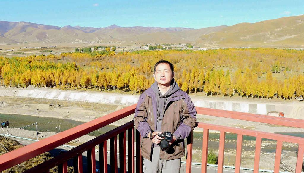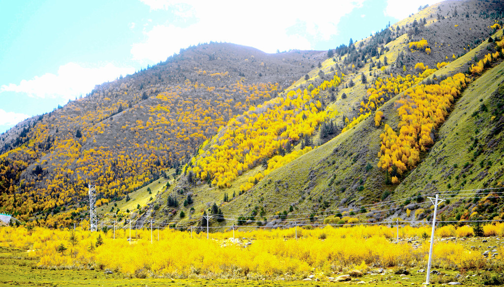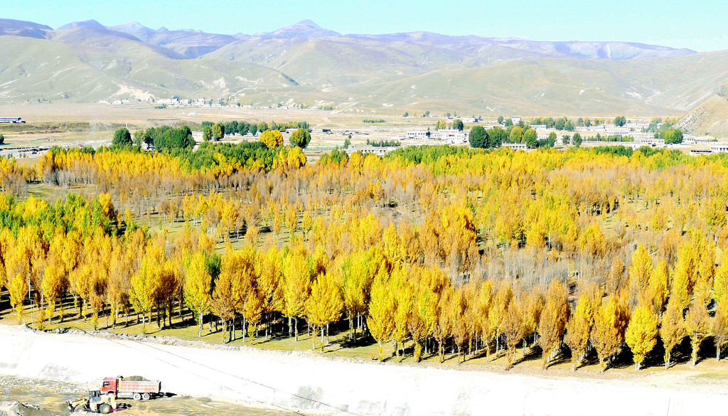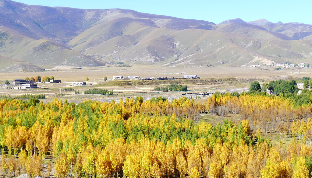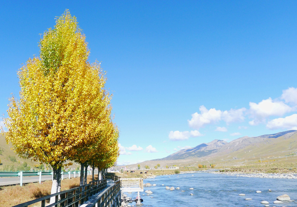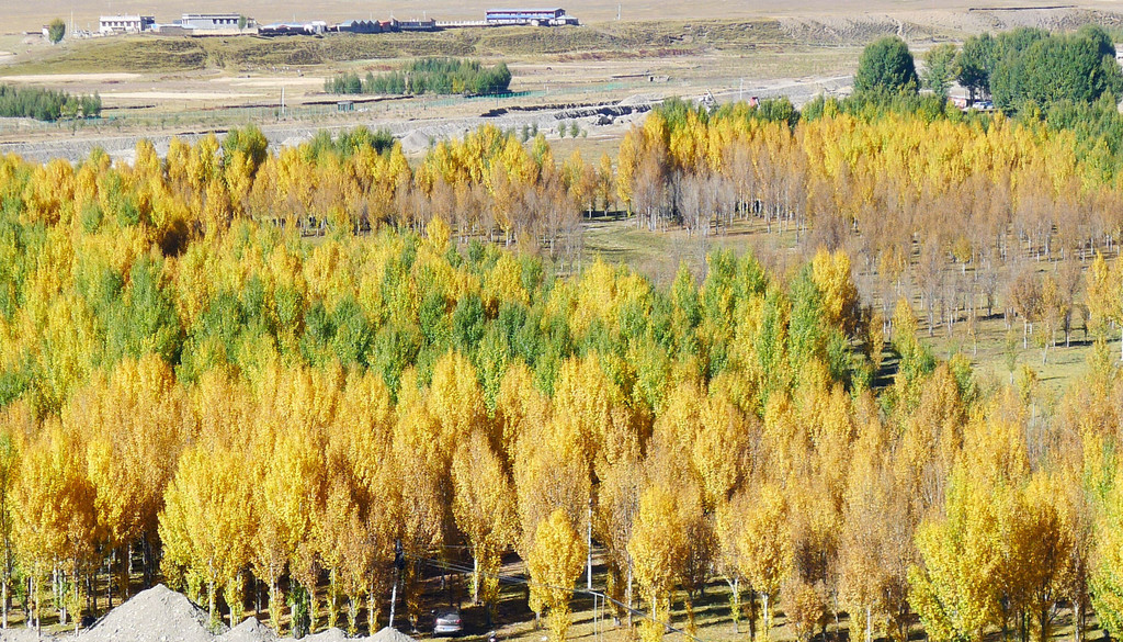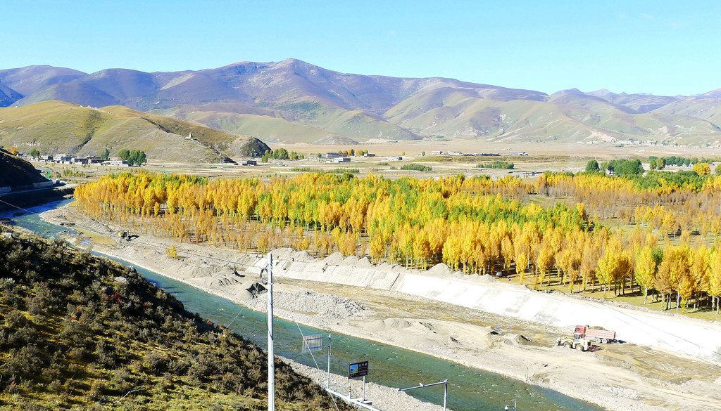 观景台是一座十数米高的钢架高台,就在公路边上,免费开放。登上高台眺望,隔河对岸就是稻城县的“万亩河滩青杨林”,此刻树叶已经变色,在碧空下呈现一片金黄,再有远处的山峦、田园、农舍衬托,景色更是好看。青杨是川西高原之特色树种,眼前的这一大片青杨都是人工种植,为了改善环境、治理风沙,稻城当地人民在数十年前就开始种植青杨,现已成林3万余亩。