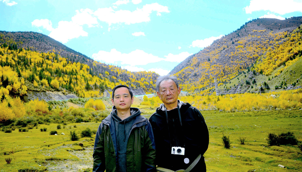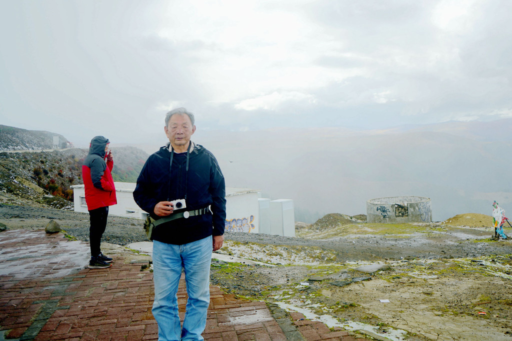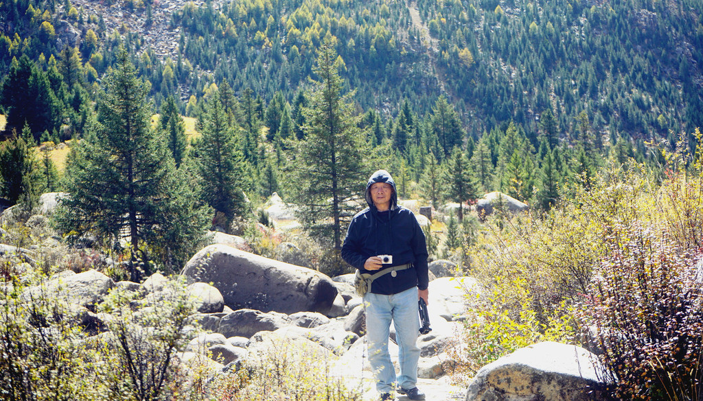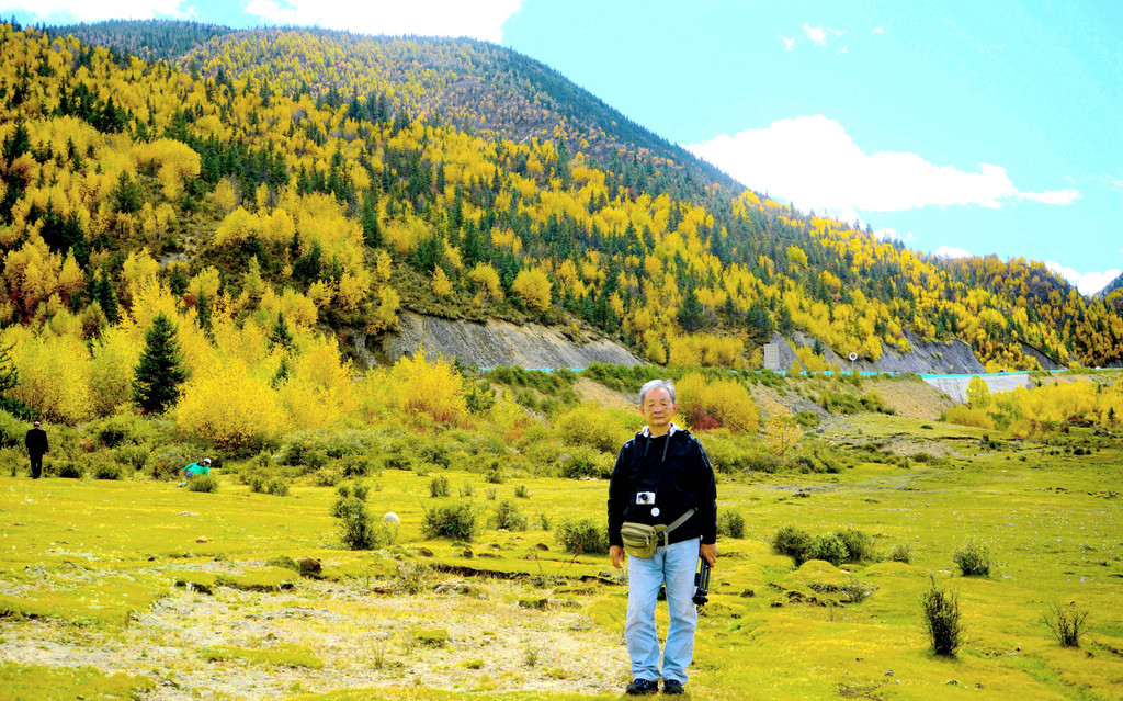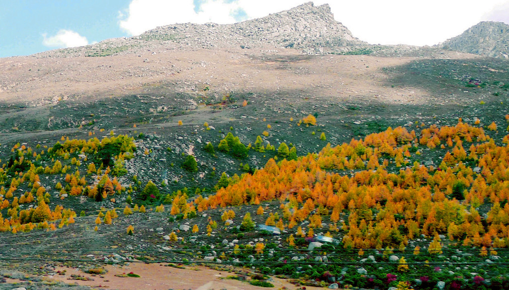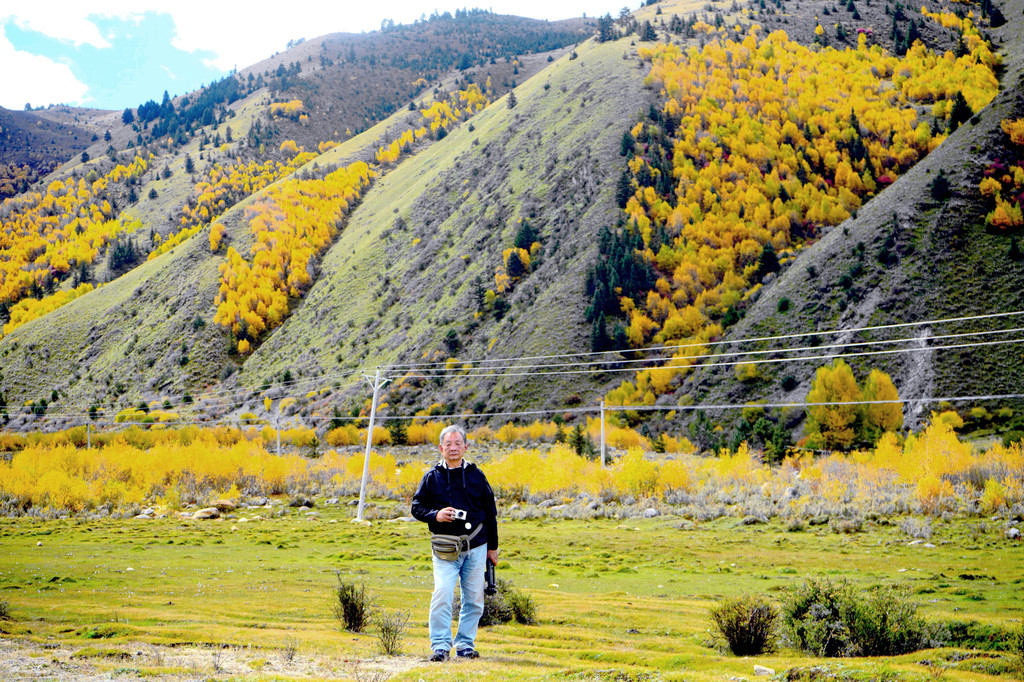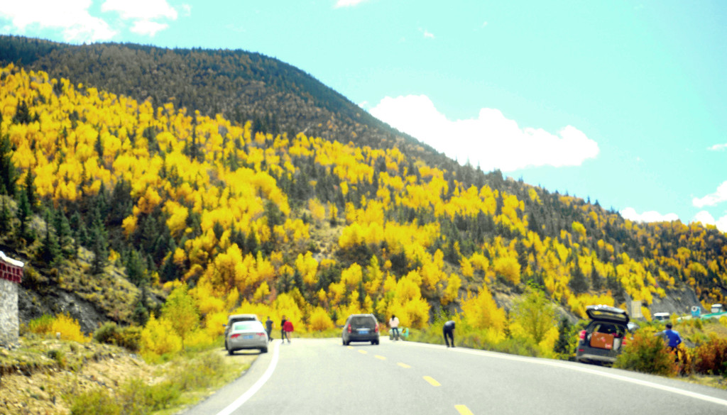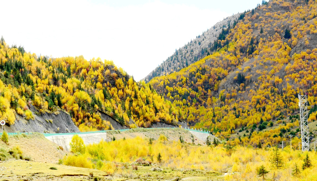 13:55驶出一个山口,前方显露一马平川,山口附近秋意正浓,两侧山坡一片金黄,偏爱自然景观的X.J.又赶忙停车,两人到路边草滩上去拍照。游罢再前行不足1公里,便是我们三天前曾经逗留的“甘孜公路康呷服务区”,又见到了那座用卵石堆砌的“海子山国家地质公园”标志墙,我们刚才驶出的山口就是海子山地质公园的入口。