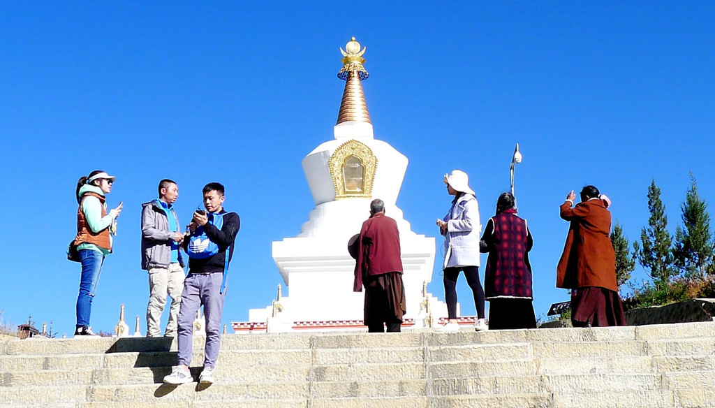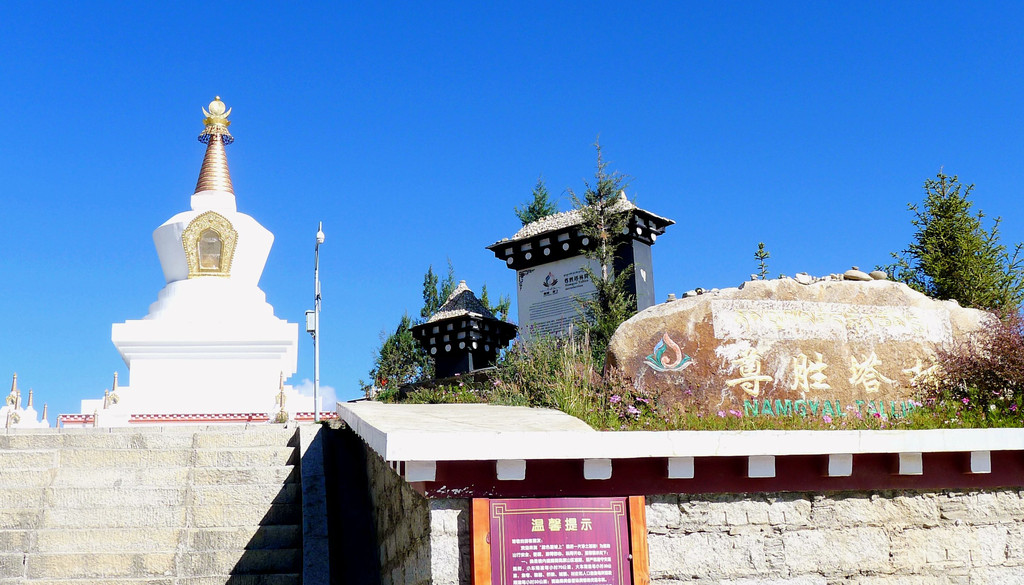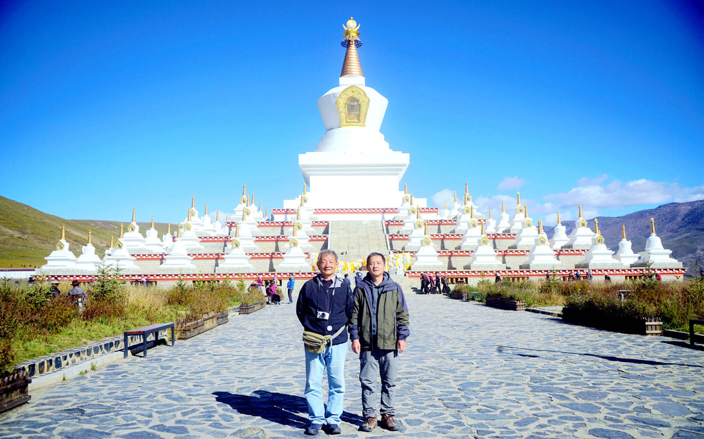 登上高台还看到远处有座白塔,走下高台又从停车场旁的“稻城县城(金珠镇)导游全图”上得知,那座白塔叫做“尊胜塔林”,它与青杨林并列为金珠镇上最著名的两处旅游景点。离开青杨林,驱车向理塘方向行驶,走没多久就看见了那座白塔,它位于稻城大桥的桥头,亦称“稻城白塔”。“尊胜塔林”造型别致,它由正中一座高大主塔,四周众多小塔环绕而成,塔体上圆下方,通体洁白如玉,高处有金顶,气势十分宏伟。我们10:09驶抵白塔,停车、观光,还请一位游人为我们拍下两人合影。