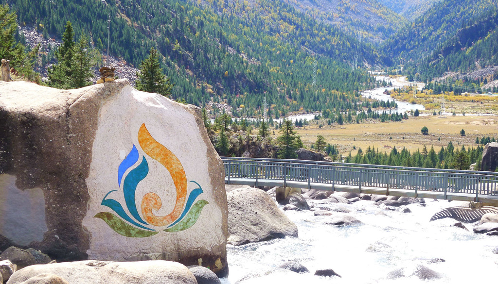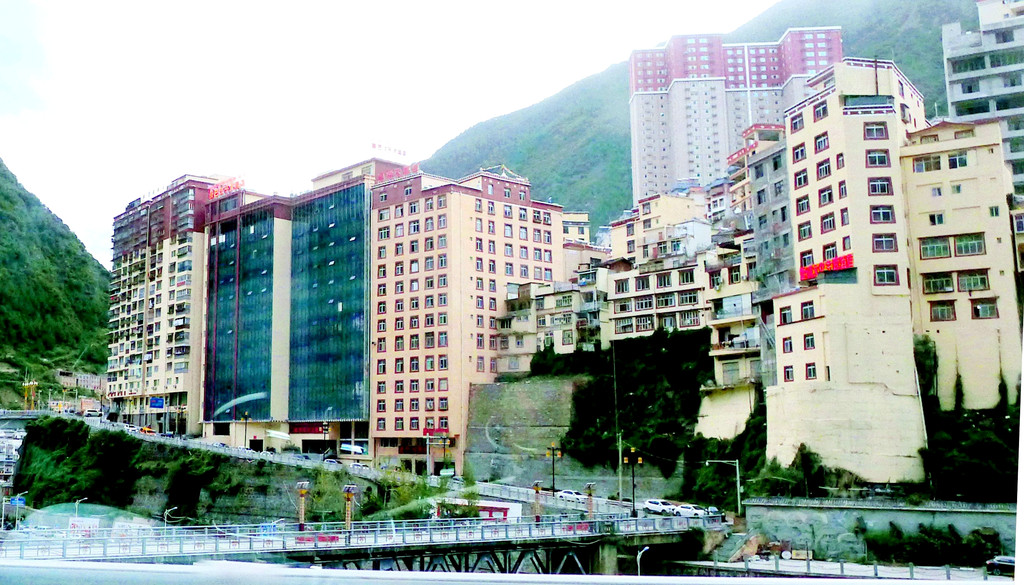 18:04驶抵雅江县城,这里海拔2600米,地处雅砻江畔,城市主要是构筑在雅砻江的右岸,放眼望去全都是高楼。我原以为是要入住雅江城内,也很期待能够借此机会看看小城是啥模样,然而,询问X.J.后才知道,他并未预定县城内的宾馆,而是选择了城外的一家“岭·米雅”文化酒店,因为据说很有“品味”。于是,“导航”指引我们绕过县城,过桥来到城区对面的雅砻江左岸,再经一条短短的隧道穿山而过,没有进城就离城而去,直驶新都桥方向。语音导航报告:目的地大约是在前方20公里处,这让我十分怀疑,X.J.到底是定了个什么样的酒店,怎么会距离县城这么远?