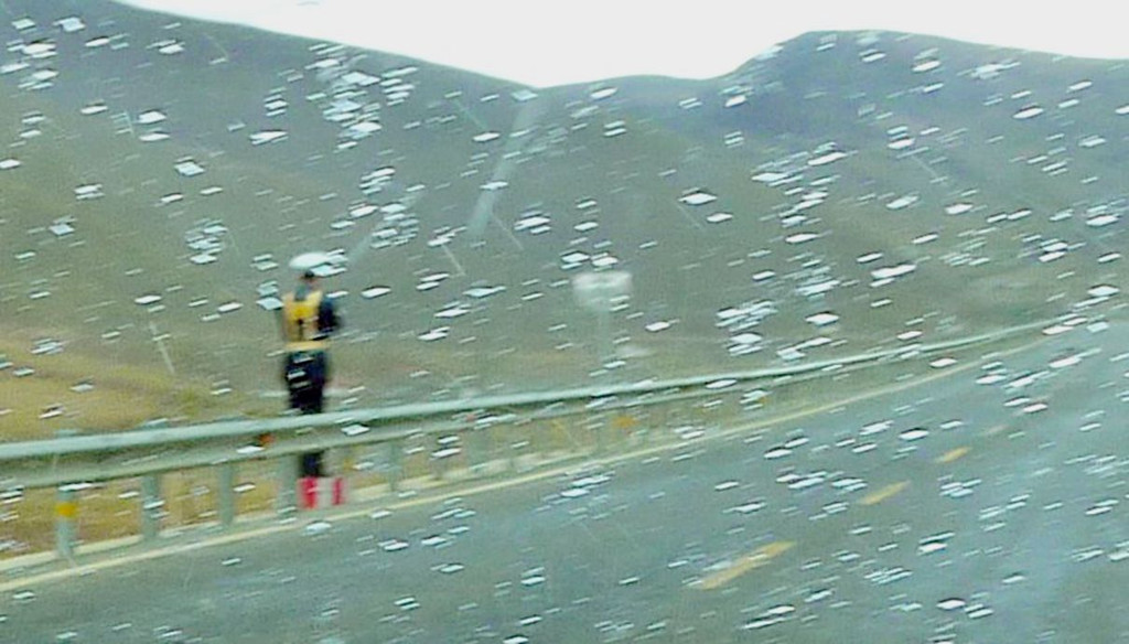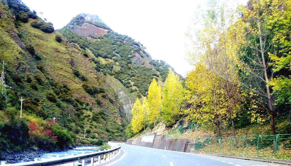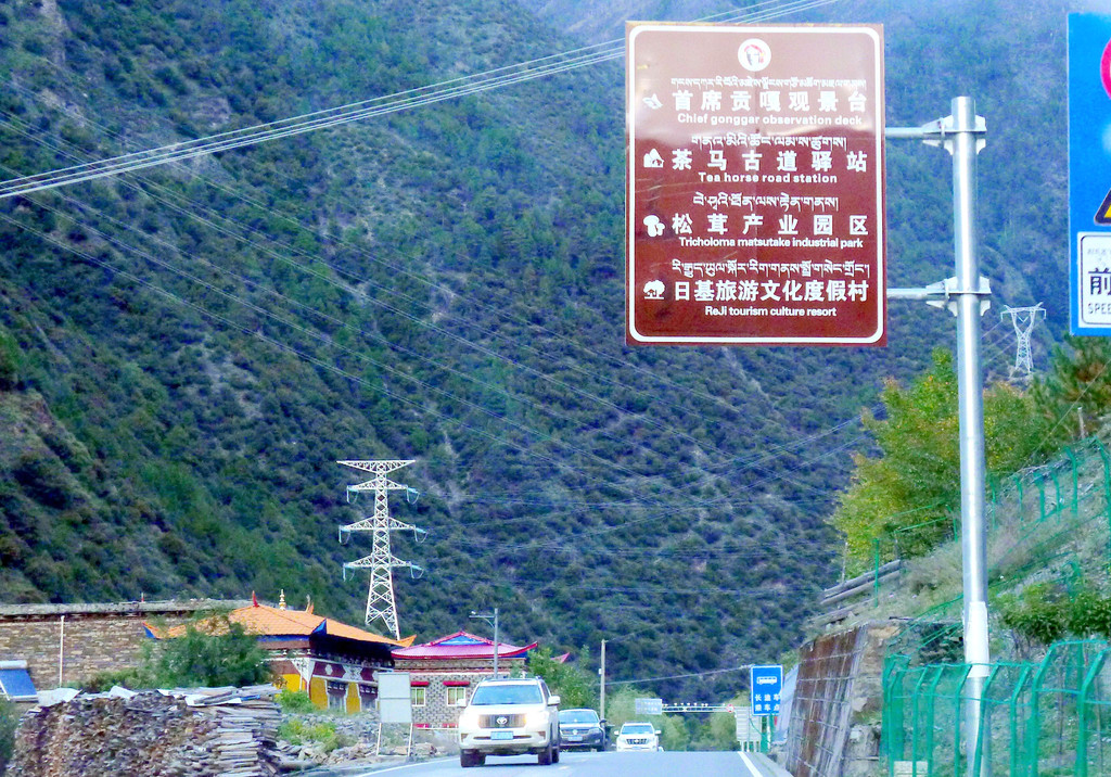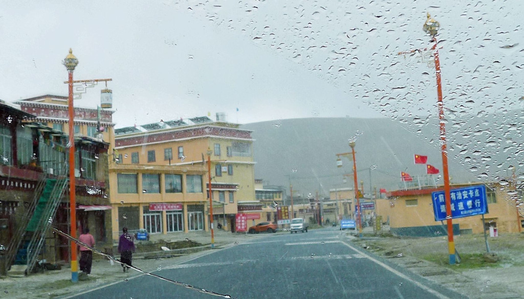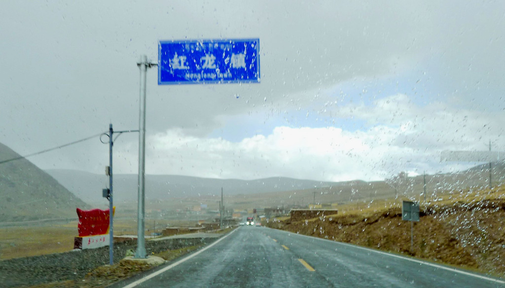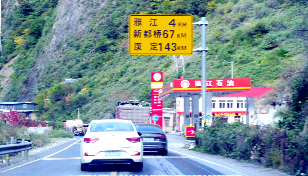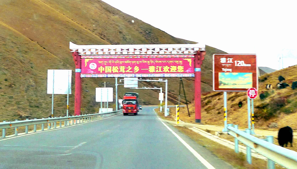 15:21通过理塘县“大河边”公安检查站,还是无人值守。两分钟后通过“中国松茸之乡—雅江欢迎您”牌坊,我们算是离开了理塘,进入雅江县境内,此处距离雅江县城120公里。15:28遇到雨夹雪,15:49驶经“红龙镇”。