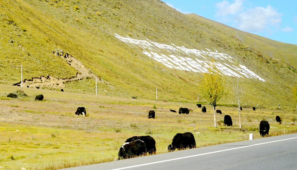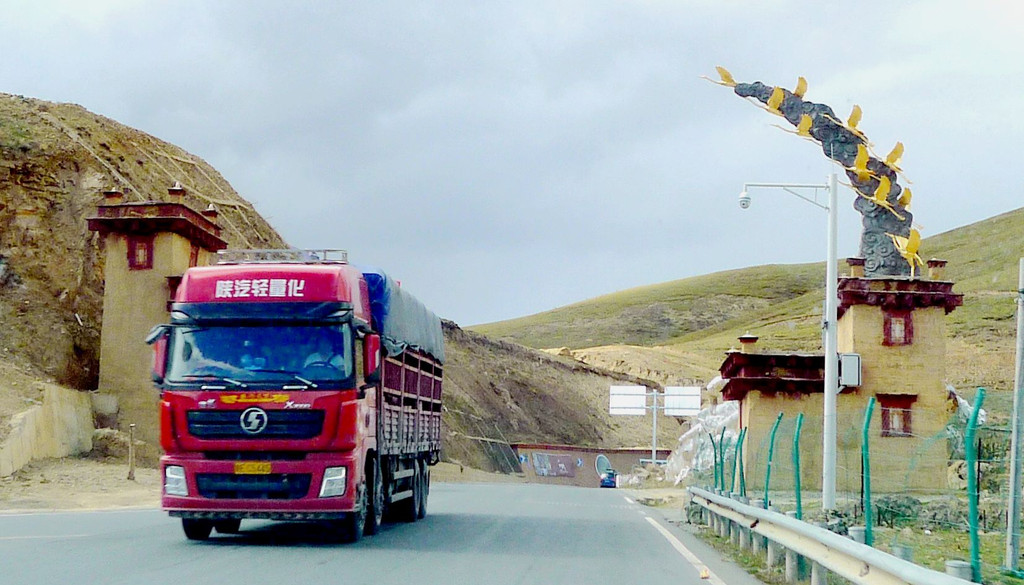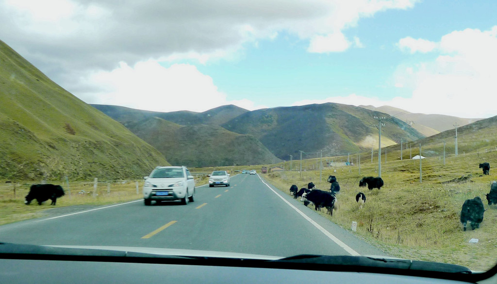 15:11驶抵“托洛纳卡”山脚,此处距离雅江133公里。“托洛纳卡”原本也是川藏线上的拦路高峰之一,过往车辆必须花费近半小时翻越垭口,2015年7月全长2830米的“理塘隧道”通车,我们只用去4分多钟就穿越了这座大山。出隧道后继续前行,路边不时可遇牦牛,它们是川藏线上的一霸,可以在任何时间突然横穿公路,路遇它们必须减速、礼让,小心通过。