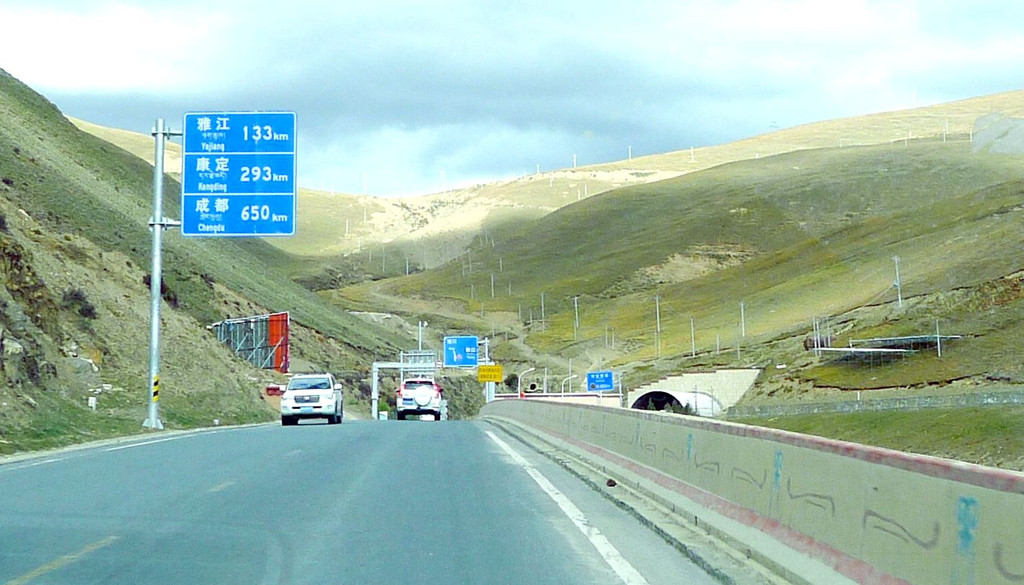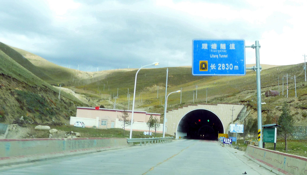 17:18经过“熊宗卡观景台”,因为三天前曾经逗留,此刻就不停。17:24穿越“剪子弯山隧道”,洞口右侧有条通往山顶垭口的岔路,在隧道建成以前,过往车辆都必须翻越海拔4659米的山顶垭口。剪子弯山隧道2014年底通车,全长2238米,理塘方向的洞口海拔4300米,雅江方向洞口海拔4200米。然而,也许是因为通车已达五年,隧道地面坑坑洼洼,洞内也无照明,必须车开大灯,限速30公里,X.J.一路抱怨是“豆腐渣工程”。