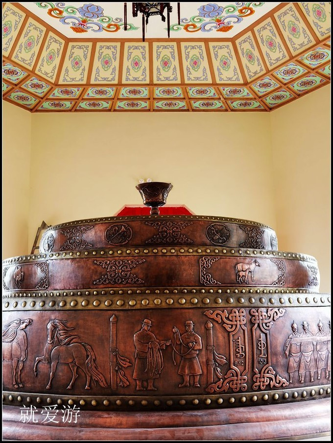 成吉思汗陵旅游区雕刻 蒙古 民族图案的汉 白玉 苏勒德祭坛是供奉成吉思汗战神的地方。以主苏勒德和四柄陪苏勒德组成的“四斿哈日苏勒德”是成吉思汗所向无敌的战神,平 安吉 祥的保护神,是成吉思汗勇往直前精神和压倒一切邪恶的力量的象征。苏勒德的缨子用九十九匹公马鬃制成。祭坛上还安放着大 蒙古 国的阿拉格苏勒德(花纛)。祭坛高15.4米,直径54米。