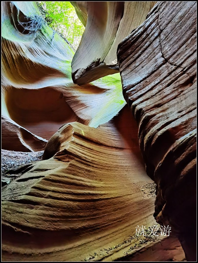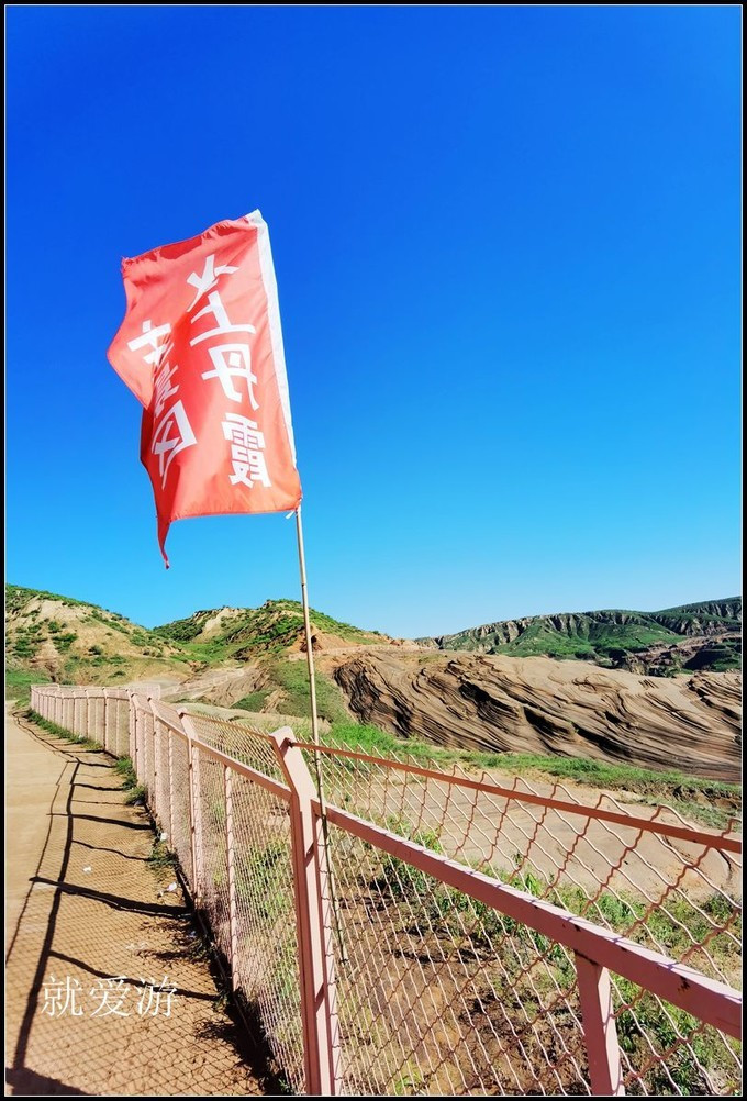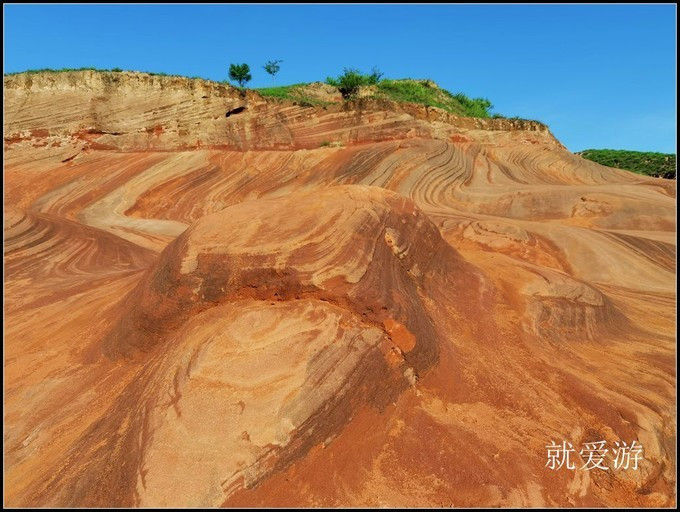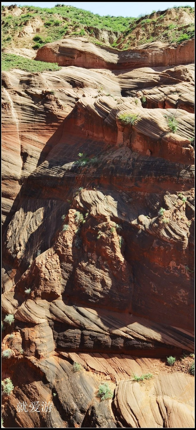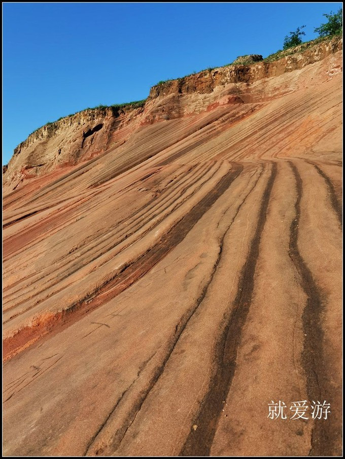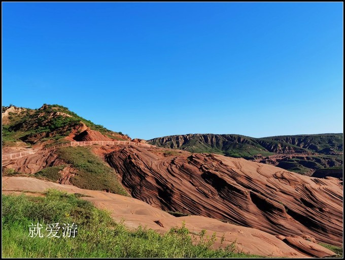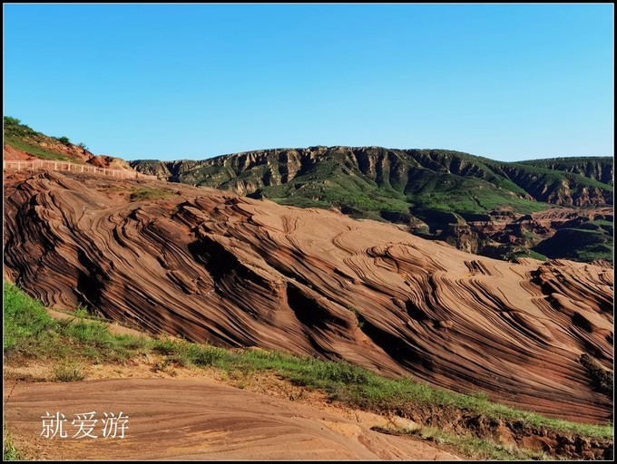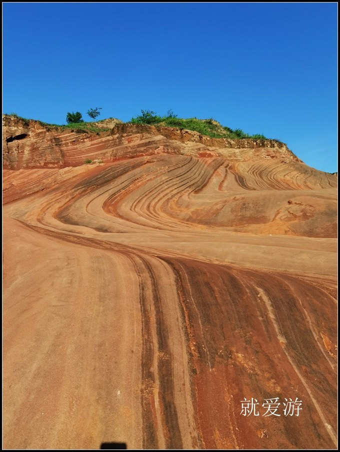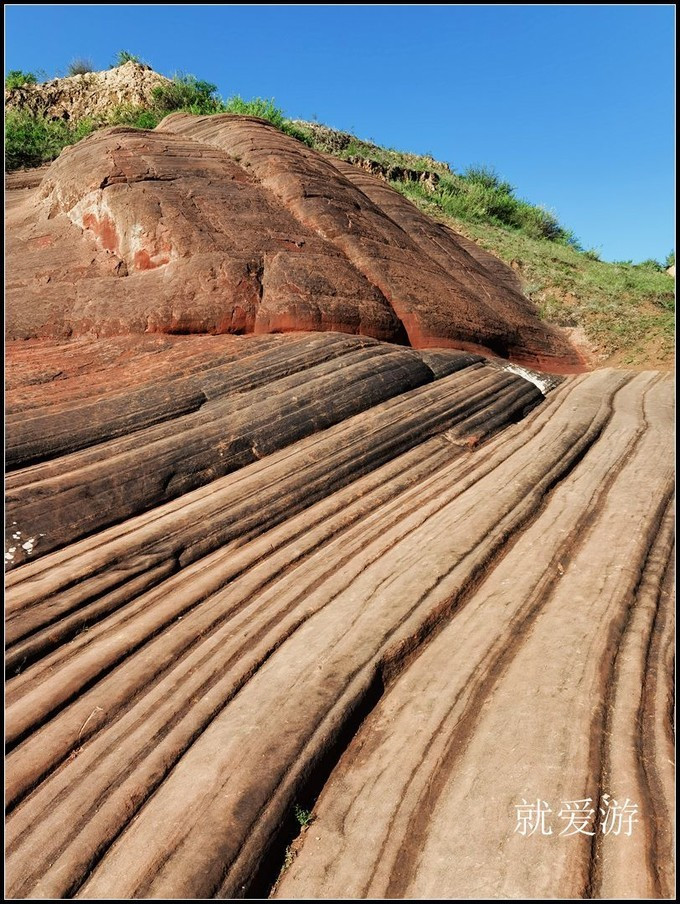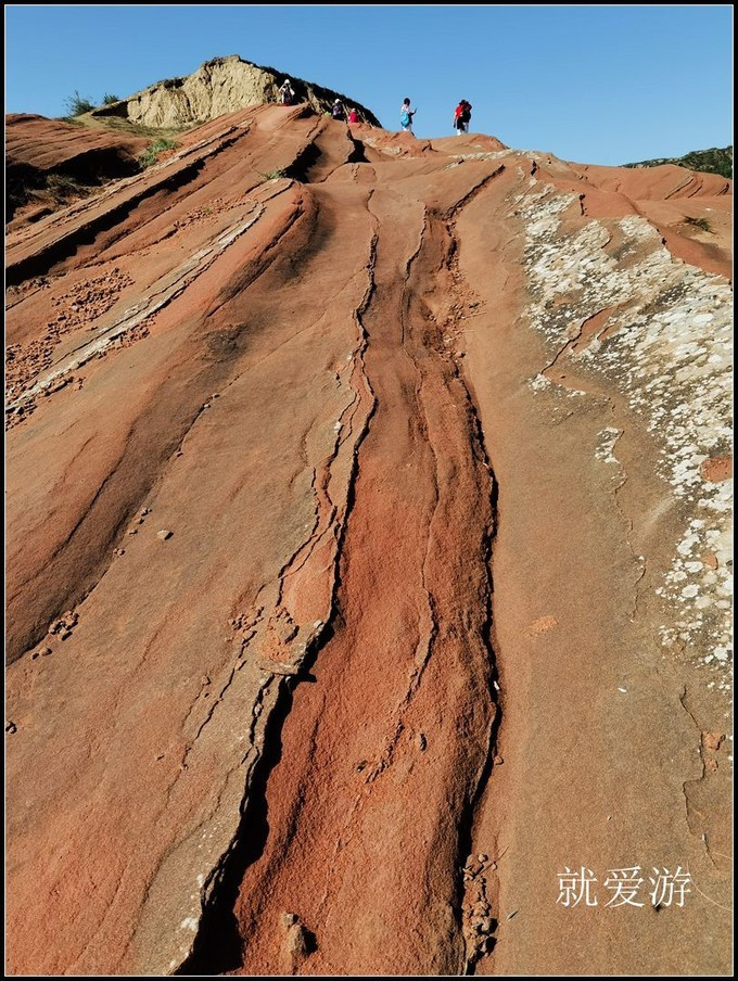 波浪谷靖边 波浪谷岩石叫红砂岩,学术上被称为砒砂岩,成于古生代二叠纪和中生代三叠纪、侏罗纪、白垩纪之间。来到波浪谷,看到红色石头像泥石流一样呈现出一种流水状,一圈圈、一坨坨、一弯弯的向沟壑中涌去。沿着沟边的红色石头一直往下走,在宽阔之处看到很大的且平整的石壁,从上到下均为红色,而且颜色基本一致。在狭窄之处,红色石头呈现出一种流水状,就像红色的泥浆一般纷涌汇聚,向沟底流淌。由于这种石头类似一种沙岩,风化脱离很严重,因此目前主景区都用铁栏网封住,防止游客进入后踩踏。