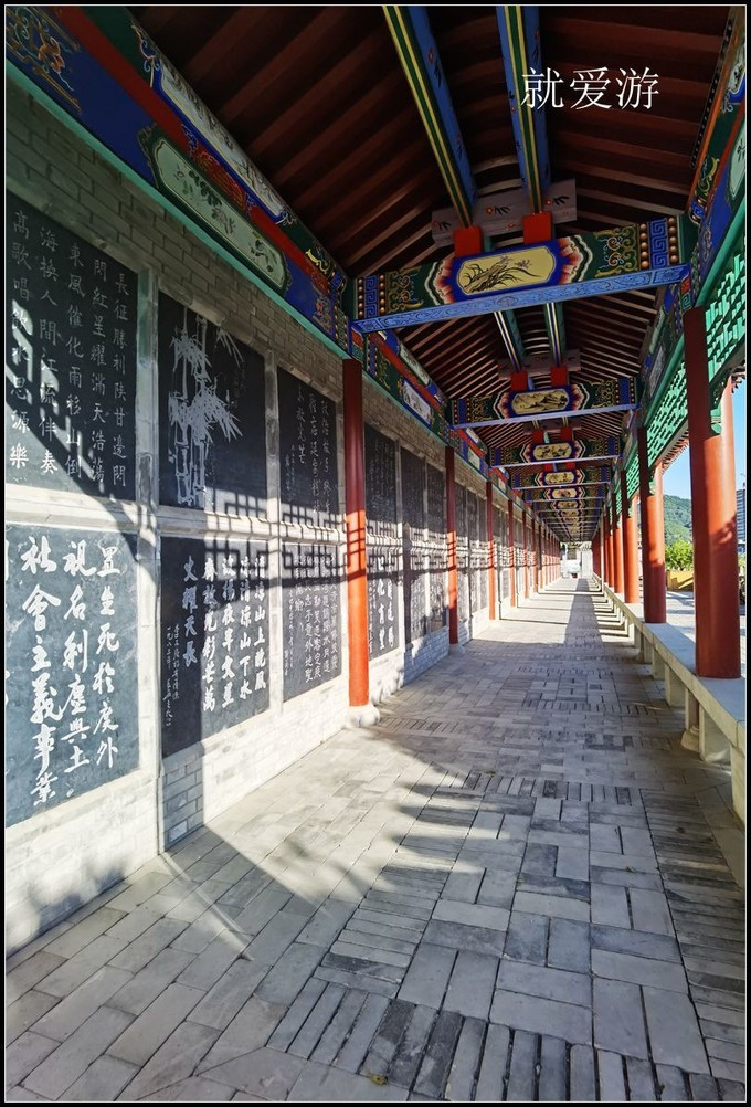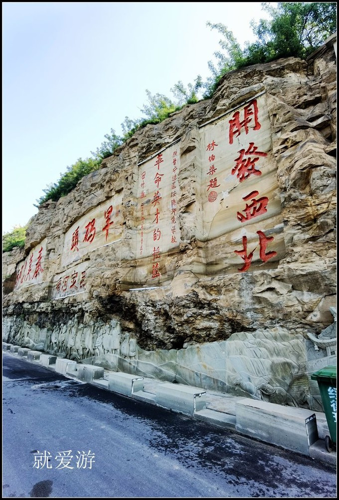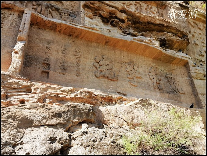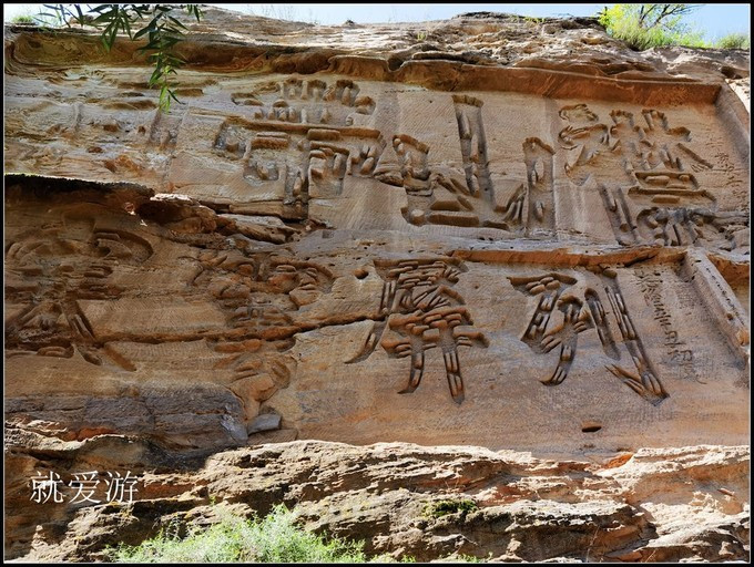 红石峡谷长约350米,峡谷东崖高约11.5米,西崖高13米,东西对峙,峭拔雄伟。峡内 玉溪 河水流湍急,穿峡直达城西。两岸垂柳青翠,景色优美。红石峡名冠边塞,旧时文官、武将、儒士来 榆林 ,必在此地设宴讽咏唱和,留下160多幅宝贵的书法艺术作品, 榆林 红石峡因此称得上是不可多得的书法艺术宝库,在它的东西石壁,摩崖石刻相连,窟洞、殿壁、碑石镶嵌的题词、题字、碑、碣大小多达一百六十多处,字大者约6米,小者寸许,篆、隶、楷、行、草齐全,笔力雄健、挺劲,文采飞扬,各放异彩,更有少见的蒙文石刻,亦是花丛一艳,堪称壮观,似一天然碑林。