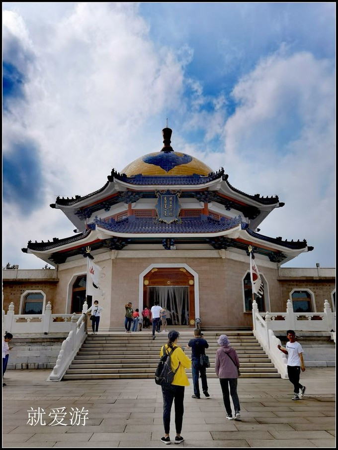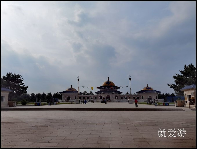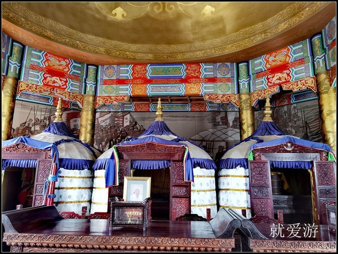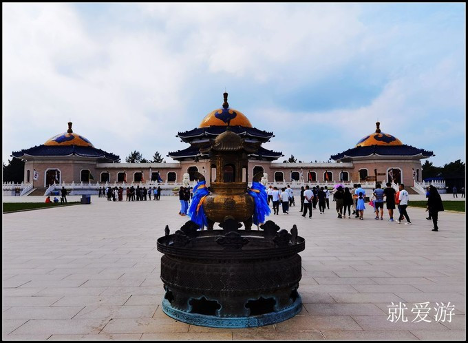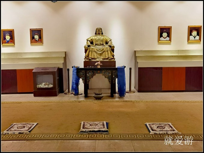 成吉思汗陵旅游区成吉思汗陵旅游区金碧辉煌的陵宫,像一只展翅飞翔的雄鹰,展现草原帝王陵恢宏气势。乳白色的墙壁,朱红的门窗,金黄宝顶、蓝色的云图,独具 蒙古 民族特色。陵宫是祭祀成吉思汗的圣地,其建筑保留了成吉思汗八白宫的形状特点,成为 蒙古 民族代表性建筑。成吉思汗陵宫由正殿、后殿、东西殿、东西过厅组成。陵宫建筑面积2000平方米,正殿高24.18米,东西殿高18米。陵宫内供奉着成吉思汗八白宫(室),并有巨幅壁画。陵宫屋檐正中悬挂着原国家副主席 乌兰 夫题写的“成吉思汗陵”牌匾。