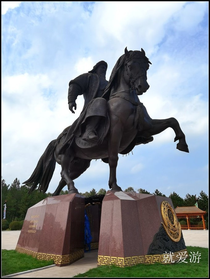 成吉思汗陵旅游区成吉思汗铜像广场象征苍天大地恩赐于世间的博大的福禄。高大的成吉思汗骑马出征铜像,再现成吉思汗西征时赞美 鄂尔多斯 是“梅花鹿儿栖身之所,戴胜鸟儿育雏之乡,衰落王朝振兴之地,白发老翁享乐之邦”的情景和崛起于马背上的伟人震撼山河的气度。铜像高6.6米,广场直径66米,寓意成吉思汗寿年。广场周围的松柏以伞形向外延伸,象征着成吉思汗精神永世传播在大地上。