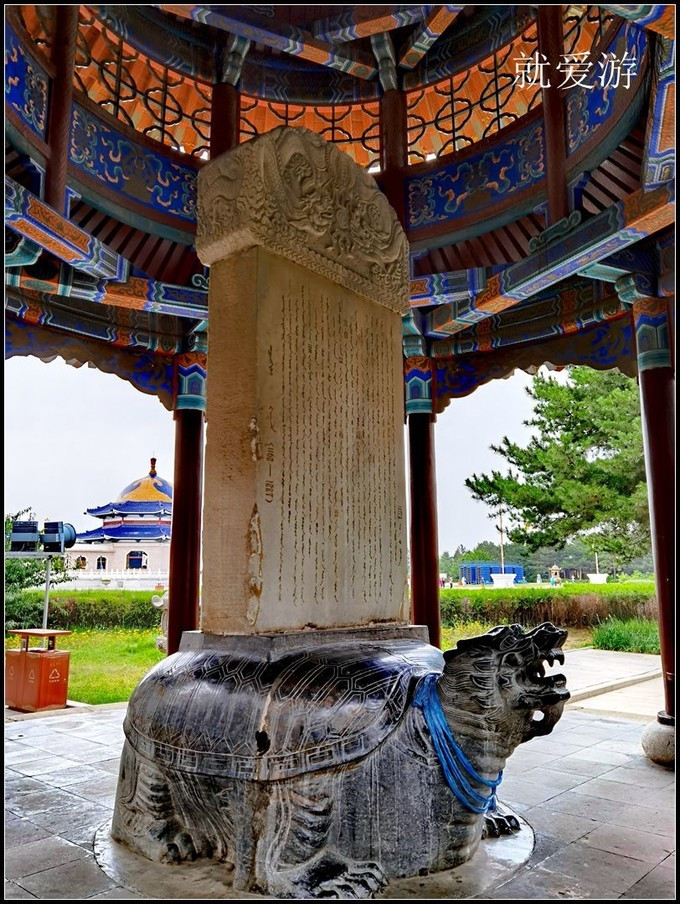 成吉思汗陵旅游区成吉思汗陵旅游区成吉思汗陵旅游区成吉思汗陵宫大院东南、西南两角,有两座碑亭,亭里立着高大的石碑。碑亭为八柱、双层檐、琉璃瓦顶,是典型的中华民族停阁建筑。亭里竖立着高大的石碑,碑座为莫大的石龟。其中一座为“成吉思汗”碑,另一座为“成吉思汗陵”碑。用蒙汉两种文字刻雕的碑文,概括地介绍了成吉思汗艰苦创业的戎马生涯和成吉思汗陵经历几个世纪变迁的沧桑历史。