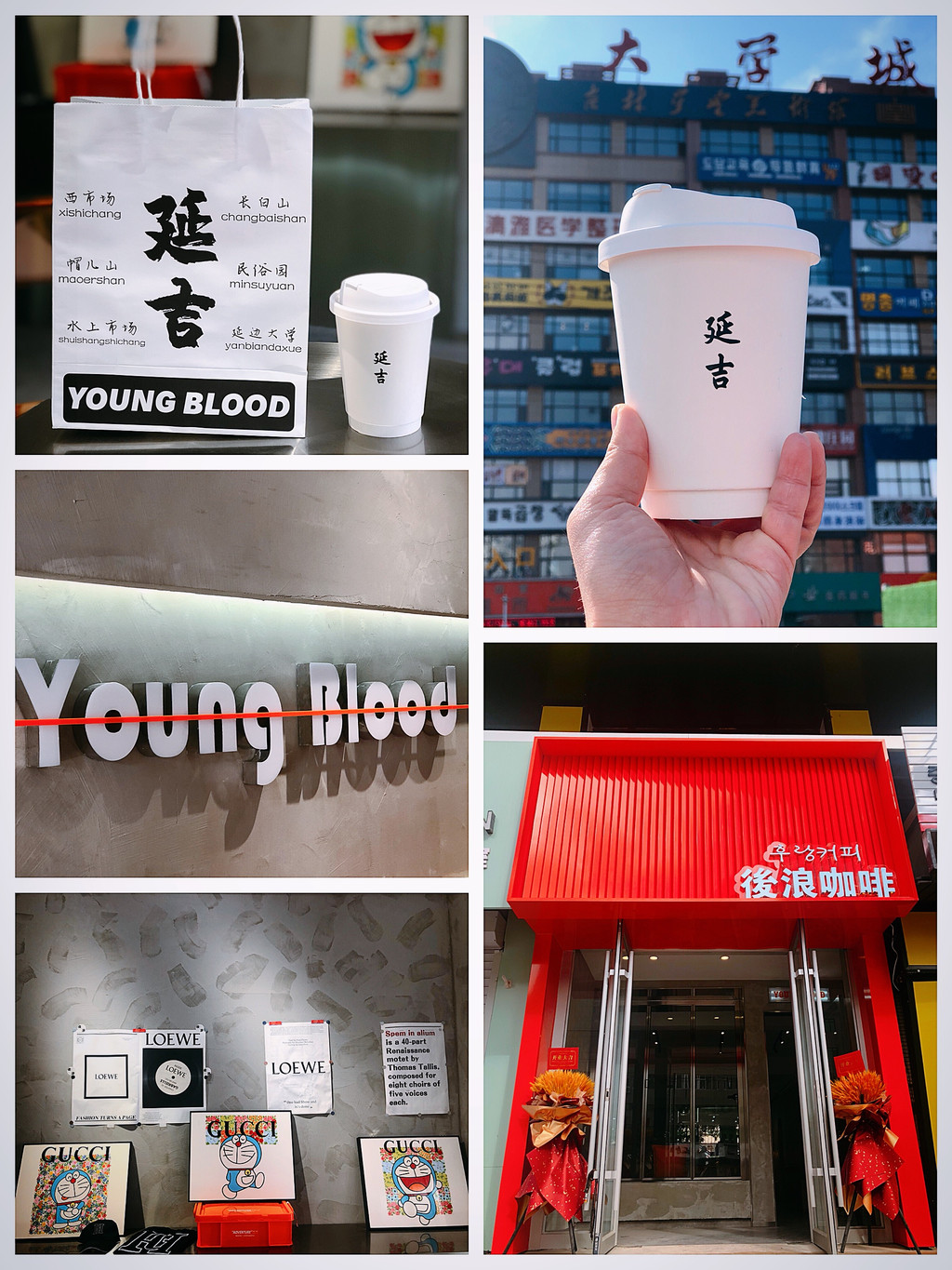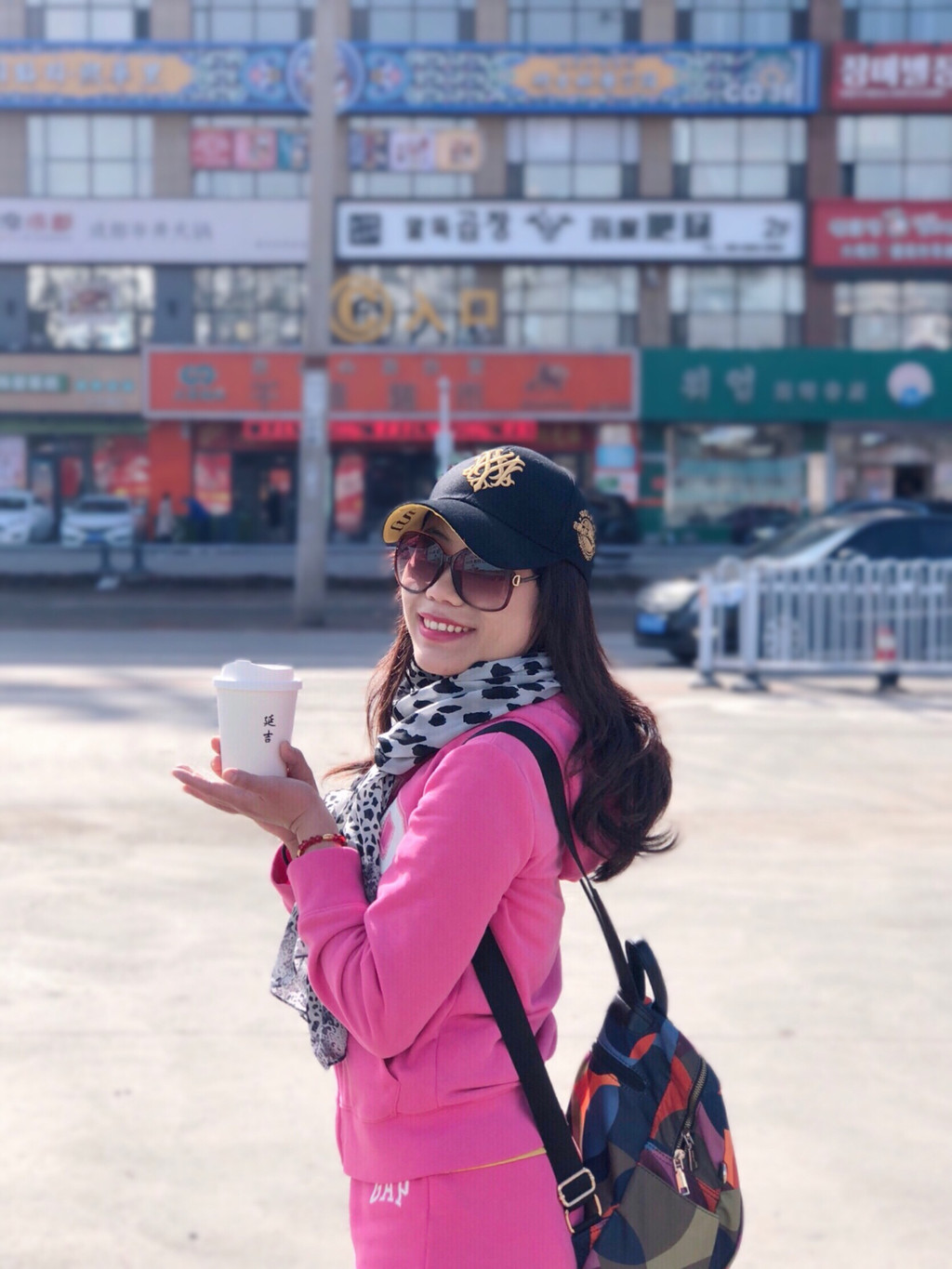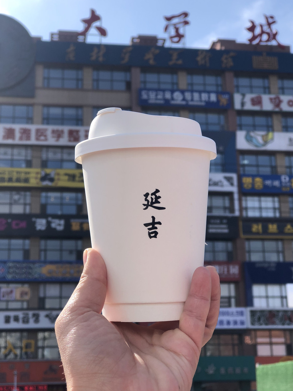 这里车水马龙,拍照一定要注意安排,不要为了摄影效果而站在马路中间,很危险。几乎来网红墙拍照都会拿上一杯后浪咖啡,主要是为了杯套上的延吉两个字,仪式感满满。我们还是不能免俗的拍几张打卡照。