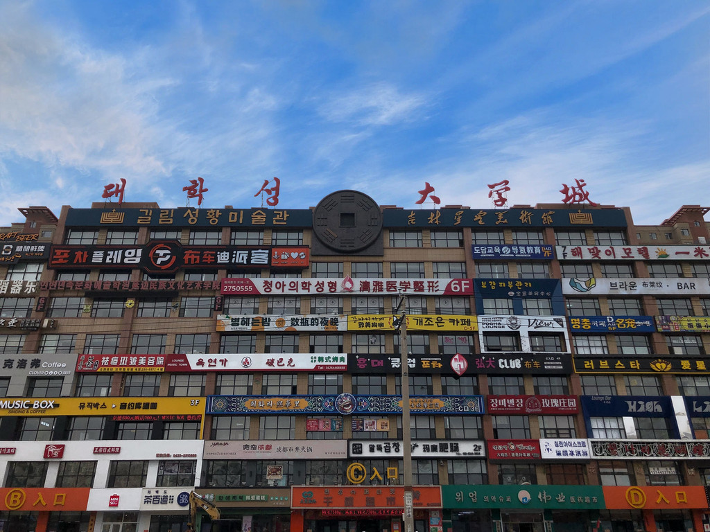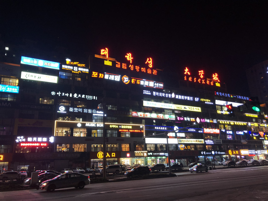 延吉建筑招牌上的文字是中文与朝鲜文双语,这样的招牌而最为密集的地方,当属延边大学对面的“大学城”,这里汇聚了当地众多特色的美食小吃,密密麻麻的广告牌,也是拍照打卡的最佳地。