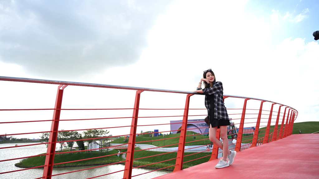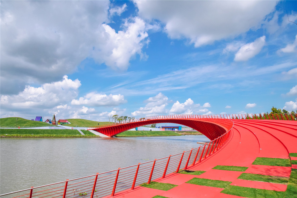 一座舒展着完美曲线的红桥,横跨在湖水上空,手牵着手走过,像是通往幸福的阶梯。