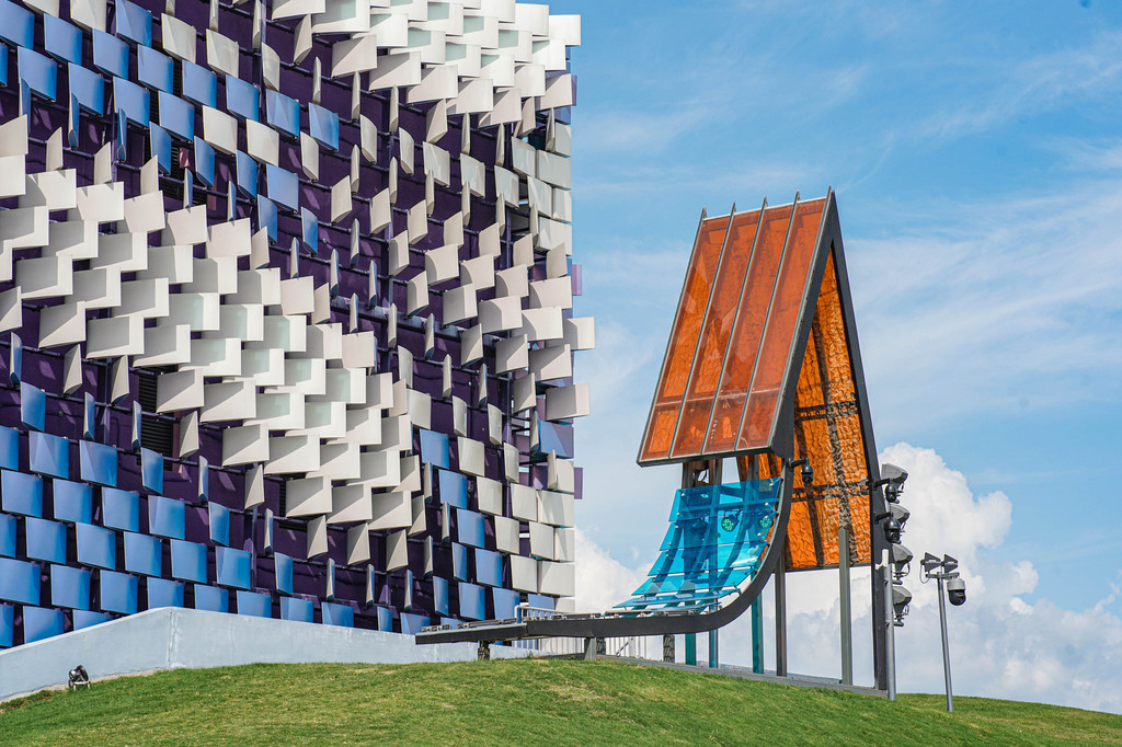 “条形剧场之幻”除了美学造诣,还有新的高科技,所以成了网红喜欢来这儿打卡的理由。幻剧场外墙设计运用了共计13140个幻彩金属板,构成了璀璨斑驳的独特景观,在太阳走到地平线之际越发珀丽壮观。