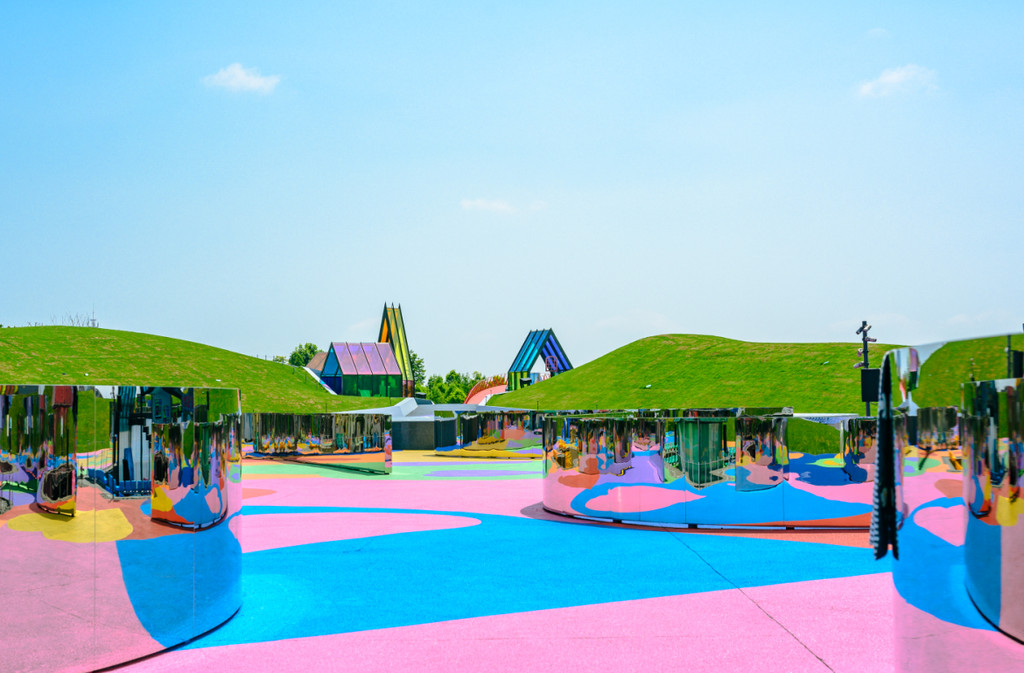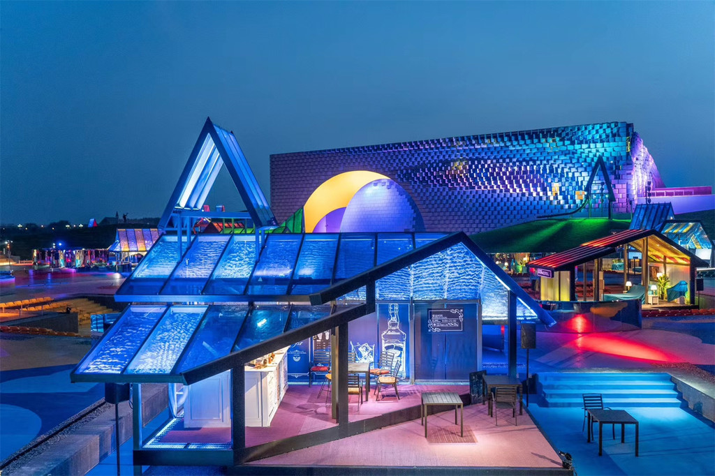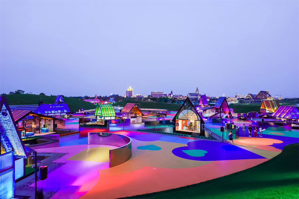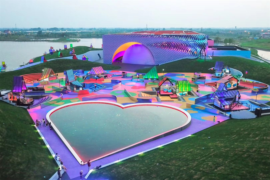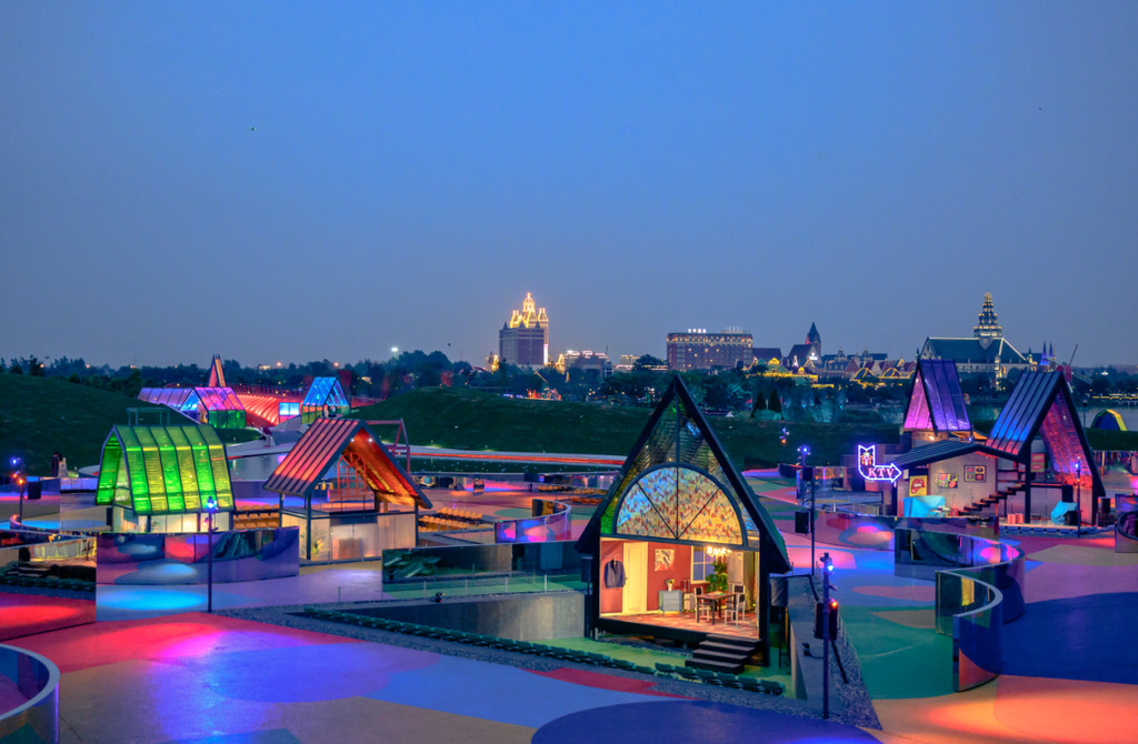 《只有爱·戏剧幻城》建在盐城大丰县荷兰花海景区内。它的“爱”直观体现在这片生机盎然花园,它的“幻”彰显在新奇的戏剧内容和闪烁着奇特幻彩的条形剧场。
