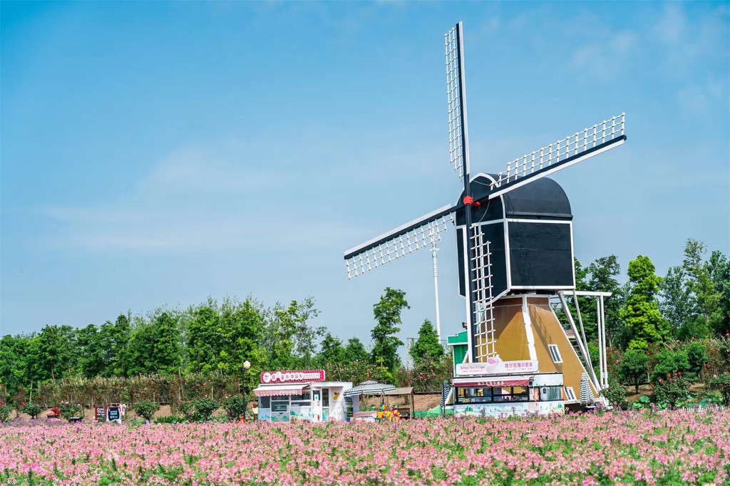 荷兰花海被称为“中国郁金香第一花海”,其实荷兰花海四季花开,各有各的风情,三月四月郁金香,五月六月玫瑰,而七月八月则是七彩的调色板。夏天的荷兰花海,自带耀眼光芒不仅拥有媲美“普罗旺斯”的薰衣草花田还集荷花、醉蝶、百日菊等众多闪光点于一身,紫红色的马鞭草、蓝紫色的鼠尾草、橙黄的波斯菊、粉白相间的醉蝶花……汇成了七彩缤纷的夏日花海。