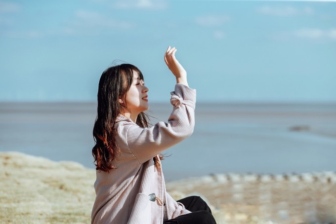迎着阳光席地而坐,伸出手让光亮透过指尖照射进来。