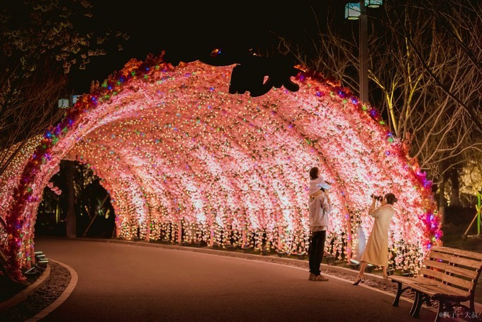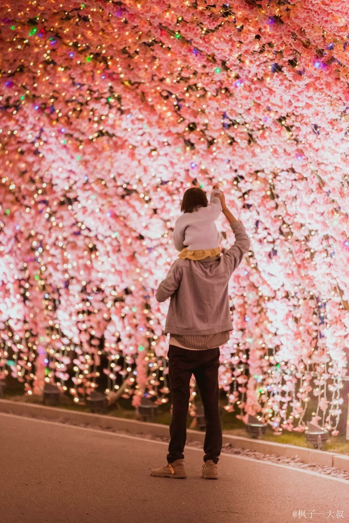 夜晚在灯光照耀下,看流光溢彩樱花园夜景、城墙主题光雕、星光隧道,又有别样的浪漫,只可惜技术不够好,无法拍出樱花与明月当空相呼应的美景,只能各位自己前来好好欣赏了。