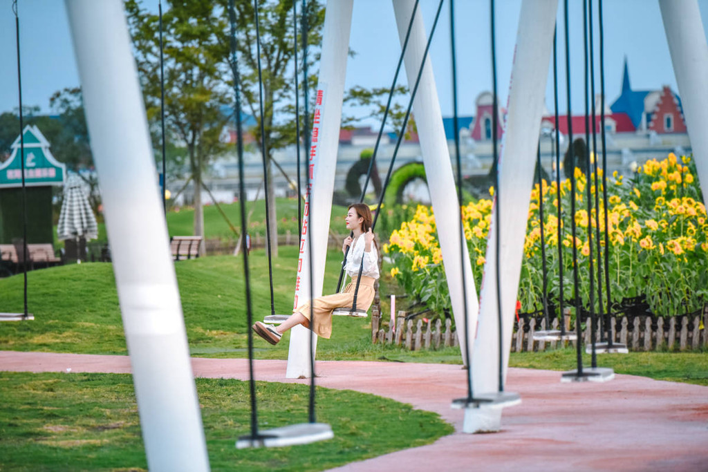 在花海的深处,是一处花海云主题乐园,踏上纯白色的螺旋式观景塔,整个花海尽入眼底,跳跳云是长不大的孩子们的乐园,可以在“云朵”中蹦蹦跳跳,还可以拍点跳跃的创意照哦。郁金香造型的滑梯,是很有特色的滚轴滑梯,从上面滑下来是柔软的白沙地,另外还有神奇的阿基米德水玩区、无动力压水机、青虫传声筒等游玩项目。