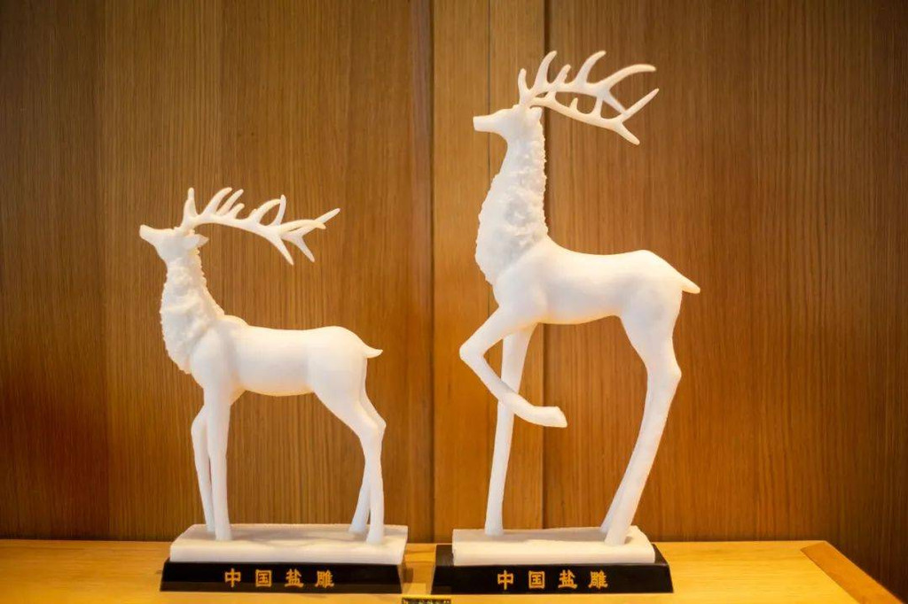 前台侧方的展柜里,摆放着本地工艺品的代表:中国盐雕。我毫不意外地看到了丹顶鹤与麋鹿两个盐城最有代表性的动物。喜欢的话,买一件回家收藏也是很有意义的。